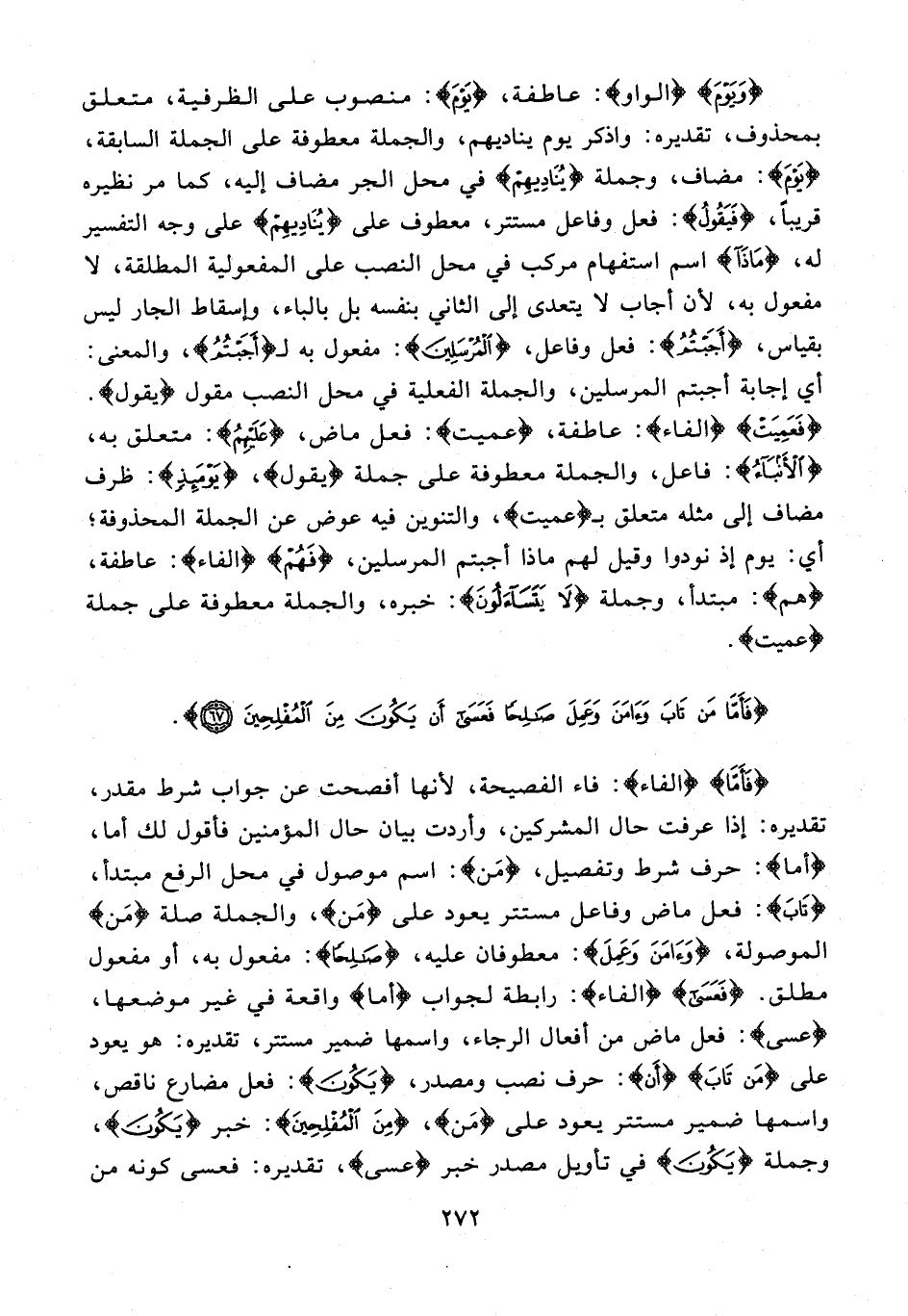 {فَأَمَّا} {الفاء}: فاء الفصيحة؛ لأنا أفصحت عن جواب شرط مقدر، تقديره: إذا عرفت حال المشركين، وأردت بيان حال المؤمنين فأقول لك أما، {أَمَّا}: حرف شرط وتفصيل، {مَنْ}: اسم موصول في محل الرفع مبتدأ، {تَابَ}: فعل ماض وفاعل مستتر يعود على {مَنْ}، والجملة صلة {مَن} الموصولة، {وَآمَنَ وَعَمِلَ}: معطوفان عليه، {صَالِحًا}: مفعول به، أو مفعول مطلق. {فَعَسَى} {الفاء}: رابطة لجواب {أما} واقعة في غير موضعها، {عَسَى}: فعل ماض من أفعال الرجاء، واسمها ضمير مستتر، تقديره: هو يعود على {مَنْ تَابَ} {أَنْ}: حرف نصب ومصدر، {يَكُونَ}: فعل مضارع ناقص، واسمها ضمير مستتر يعود على {مِنَ}، {مِنَ الْمُفْلِحِينَ}: خبر {يَكُونَ}، وجملة {يَكُونَ} في تأويل مصدر خبر {عَسَى}، تقديره: فعسى كونه من