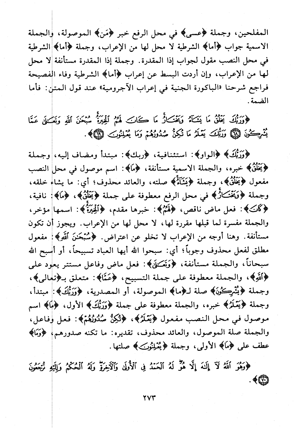 {وَرَبُّكَ} {الواو}: استئنافية، {رَبُّكَ}: مبتدأ ومضاف إليه، وجملة {يَخْلُقُ} خبره، والجملة الاسمية مستأنفة، {مَا}: اسم موصول في محل النصب مفعول {يَخْلُقُ}، وجملة {يَشَاءُ} صلته، والعائد محذوف؛ أي: ما يشاء خلقه، وجملة {وَيَخْتَارُ} في محل الرفع معطوفة على جملة {يَخْلُقُ}، {مَا}: نافية، {كَانَ}: فعل ماض ناقص، {لَهُمُ}: خبرها مقدم، {الْخِيَرَةُ}: اسمها مؤخر، والجملة مفسرة لما قبلها مقررة لها، لا محل لها من الإعراب. ويجوز أن تكون مستأنفة. وهنا أوجه من الإعراب لا تخلو عن اعتراض. {سُبْحَانَ اللَّهِ}: مفعول مطلق لفعل محذوف وجوبًا؛ أي: سبحوا الله أيها العباد تسبيحًا، أو أسبح الله سبحانًا، والجملة مستأنفة، {وَتَعَالَى}: فعل ماض وفاعل مستتر يعود على {اللَّهِ}، والجملة معطوفة على جملة التسبيح، {عَمَّا}: متعلق بـ {تعالى}، وجملة {يُشْرِكُونَ} صلة لـ {ما} الموصولة، أو المصدرية، {وَرَبُّكَ}: مبتدأ، وجملة {يَعْلَمُ} خبره، والجملة معطوفة على جملة {وَرَبُّكَ} الأول، {مَا} اسم موصول في محل النصب مفعول {يَعْلَمُ}، {تُكِنُّ صُدُورُهُمْ}: فعل وفاعل، والجملة صلة الموصول، والعائد محذوف، تقديره: ما تكنه صدورهم، {وَمَا} عطف على {مَا} الأولى، وجملة {يُعْلِنُونَ} صلتها.