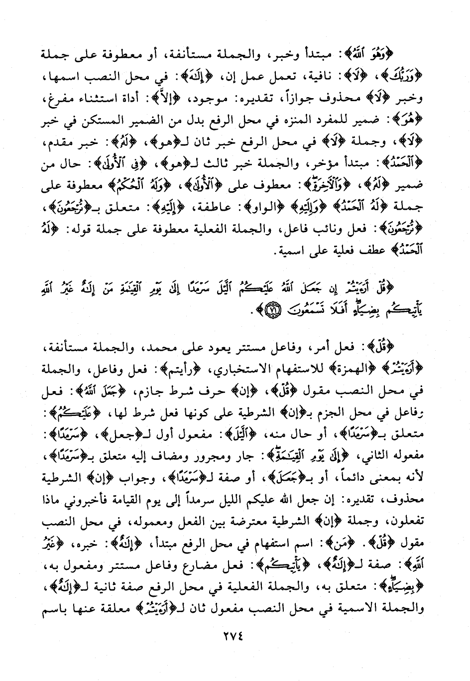 {قُلْ}: فعل أمر، وفاعل مستتر يعود على محمد، والجملة مستأنفة، {أَرَأَيْتُمْ} {الهمزة} للاستفهام الاستخباري، {رَأَيْتُمْ}: فعل وفاعل، والجملة في محل النصب مقول {قُلْ}، {إن} حرف شرط جازم، {جَعَلَ اللَّهُ}: فعل وفاعل في محل الجزم بـ {إن} الشرطية على كونها فعل شرط لها، {عَلَيْكُمُ}: متعلق بـ {سَرْمَدًا}، أو حال منه، {اللَّيْلَ}: مفعول أول لـ {جَعَلَ}، {سَرْمَدًا}: مفعوله الثاني، {إِلَى يَوْمِ الْقِيَامَةِ}؛ جار ومجرور ومضاف إليه متعلق بـ {سَرْمَدًا}، لأنه بمعنى دائمًا، أو بـ {جَعَلَ}، أو صفة لـ {سَرْمَدًا}، وجواب {إن} الشرطية محذوف، تقديره: إن جعل الله عليكم الليل سرمدًا إلى يوم القيامة فأخبروني ماذا تفعلون، وجملة {إن} الشرطية معترضة بين الفعل ومعموله، في محل النصب مقول {قُلْ}. {مَنْ}: اسم استفهام في محل الرفع مبتدأ، {إِلَهٌ}: خبره، {غَيْرُ اللَّهِ}: صفة لـ {إِلَهٌ}، {يَأْتِيكُمْ}: فعل مضارع وفاعل مستتر ومفعول به، {بِضِيَاءٍ}: متعلق به، والجملة الفعلية في محل الرفع صفة ثانية لـ {إِلَهٌ}، والجملة الاسمية في محل النصب مفعول ثان لـ {أَرَأَيْتُمْ} معلقة عنها باسم