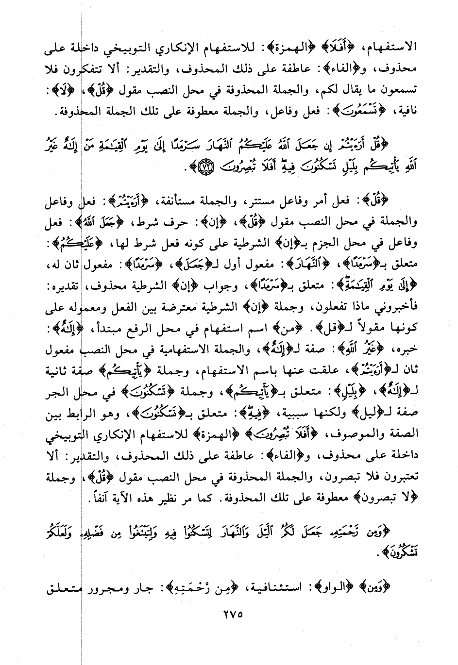 {قُلْ}: فعل أمر وفاعل مستتر، والجملة مستأنفة، {أَرَأَيْتُمْ}: فعل وفاعل والجملة في محل النصب مقول {قُلْ}، {إن}: حرف شرط، {جَعَلَ اللَّهُ}: فعل وفاعل في محل الجزم بـ {إن} الشرطية على كونه فعل شرط لها، {عَلَيْكُمُ}: متعلق بـ {سَرْمَدًا}، {النَّهَارَ}: مفعول أول لـ {جَعَلَ}، {سَرْمَدًا}: مفعول ثان له، {إِلَى يَوْمِ الْقِيَامَةِ}: متعلق بـ {سَرْمَدًا}، وجواب {إن} الشرطية محذوف، تقديره: فأخبروني ماذا تفعلون، وجملة {إن} الشرطية معترضة بين الفعل ومعموله على كونها مقولًا لـ {قُلْ}. {مَنْ} اسم استفهام في محل الرفع مبتدأ، {إِلَهٌ}: خبره، {غَيْرُ اللَّهِ}: صفة لـ {إِلَهٌ}، والجملة الاستفهامية في محل النصب مفعول ثان لـ {أَرَأَيْتُمْ}، علقت عنها باسم الاستفهام، وجملة {يَأْتِيكُمْ} صفة ثانية لـ {إِلَهٌ}، {بِلَيْلٍ}: متعلق بـ {يَأْتِيكُمْ}، وجملة {تَسْكُنُونَ} في محل الجر صفة لـ {لَيْلٍ} ولكنها سببية، {فِيهِ}: متعلق بـ {تَسْكُنُونَ}، وهو الرابط بين الصفة والموصوف، {أَفَلَا تُبْصِرُونَ} {الهمزة} للاستفهام الإنكاري التوبيخي داخلة على محذوف، و {الفاء}: عاطفة على ذلك المحذوف، والتقدير: ألا تعتبرون فلا تبصرون، والجملة المحذوفة في محل النصب مقول {قُلْ}، وجملة {تُبْصِرُونَ} معطوفة على تلك المحذوفة. كما مر نظير هذه الآية آنفًا.