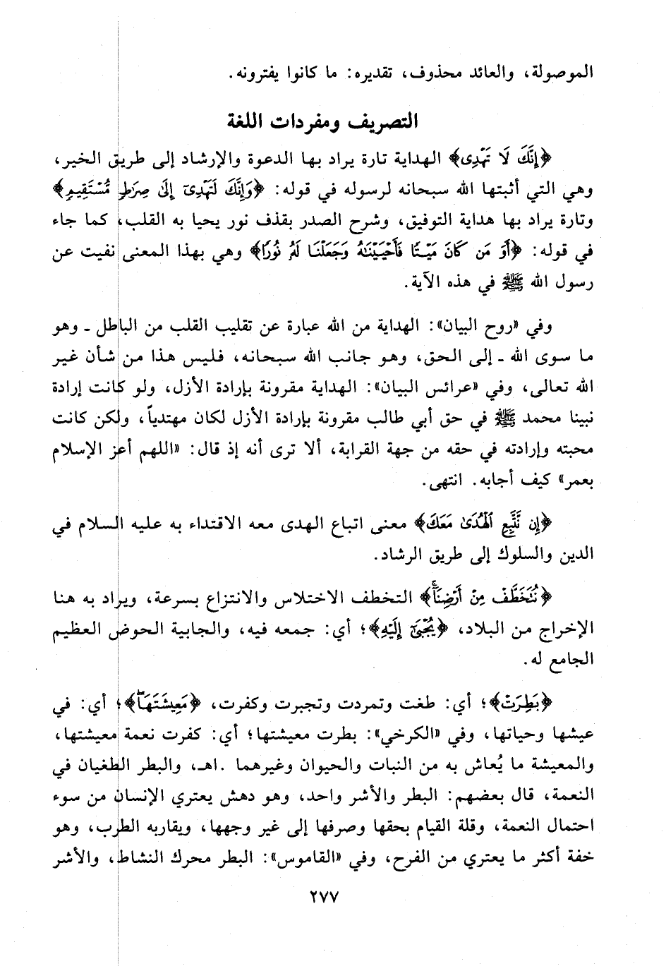 وفي "روح البيان": الهداية من الله عبارة عن تقليب القلب من الباطل - وهو ما سوى الله - إلى الحق، وهو جانب الله سبحانه، فليس هذا من شأن غير الله تعالى، وفي "عرائس البيان": الهداية مقرونة بإرادة الأزل، ولو كانت إرادة نبينا محمد - صلى الله عليه وسلم - في حق أبي طالب مقرونة بإرادة الأزل لكان مهتديًا، ولكن كانت محبته وإرادته في حقه من جهة القرابة، ألا ترى أنه إذ قال: "اللهم أعز الإِسلام بعمر" كيف أجابه. انتهى.