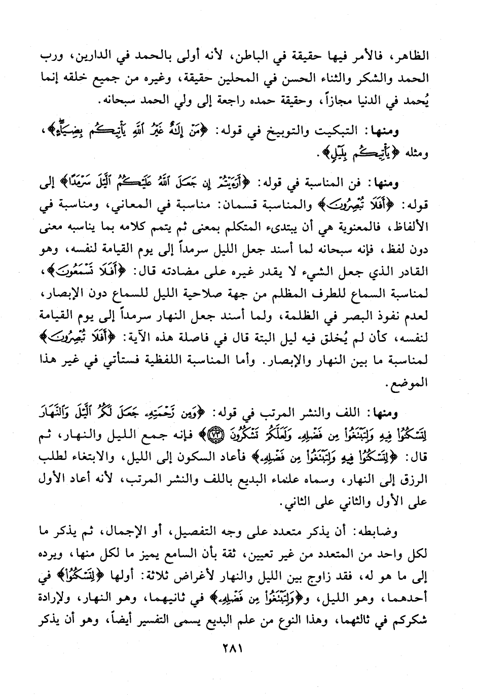 ومنها: اللف والنشر المرتب في قوله: {وَمِنْ رَحْمَتِهِ جَعَلَ لَكُمُ اللَّيْلَ وَالنَّهَارَ لِتَسْكُنُوا فِيهِ وَلِتَبْتَغُوا مِنْ فَضْلِهِ وَلَعَلَّكُمْ تَشْكُرُونَ (73)} فإنه جمع الليل والنهار، ثم قال: {لِتَسْكُنُوا فِيهِ وَلِتَبْتَغُوا مِنْ فَضْلِهِ} فأعاد السكون إلى الليل، والابتغاء لطلب الرزق إلى النهار، وسماه علماء البديع باللف والنشر المرتب؛ لأنه أعاد الأول على الأول والثاني على الثاني.