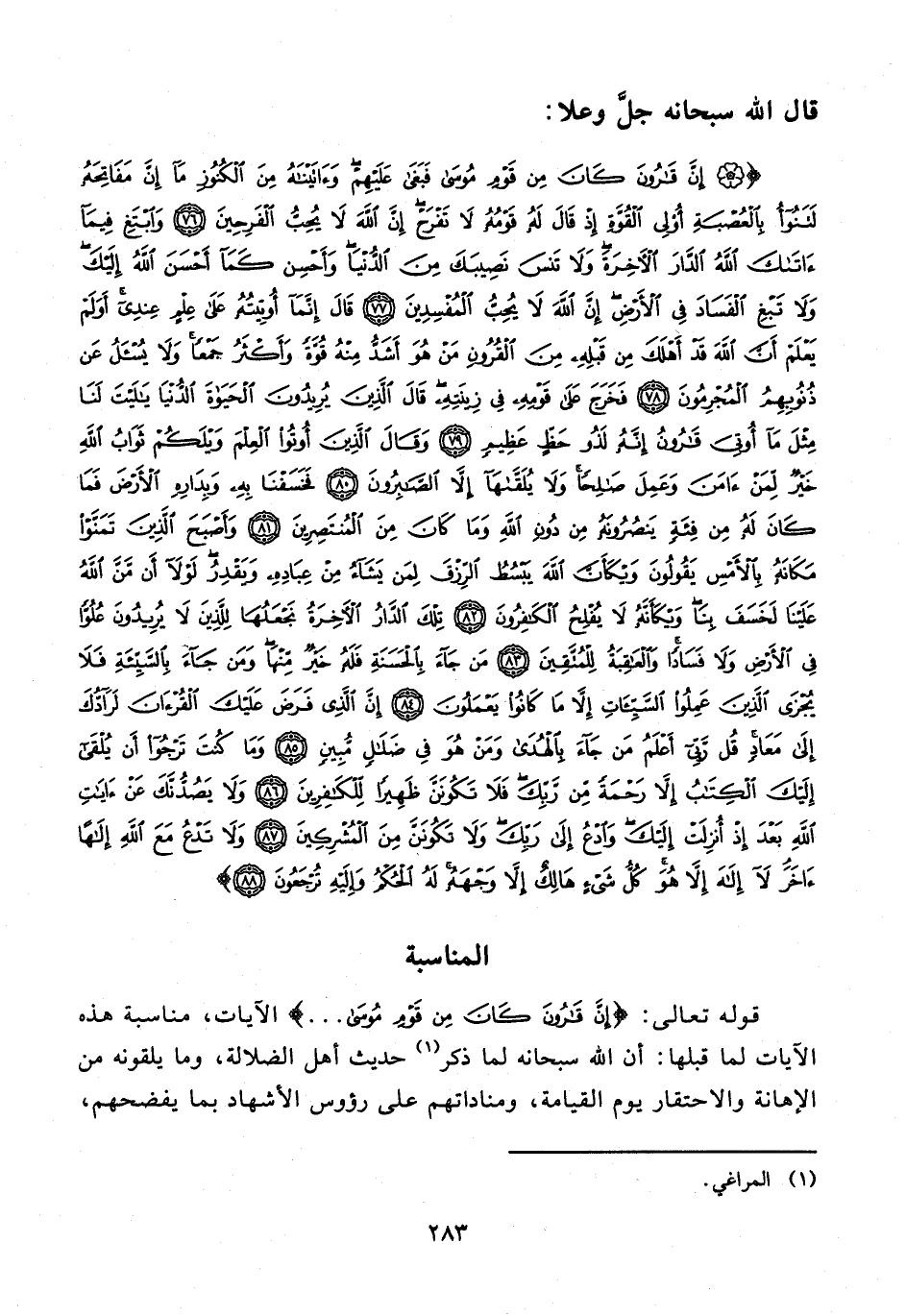 {إِنَّ قَارُونَ كَانَ مِنْ قَوْمِ مُوسَى فَبَغَى عَلَيْهِمْ وَآتَيْنَاهُ مِنَ الْكُنُوزِ مَا إِنَّ مَفَاتِحَهُ لَتَنُوءُ بِالْعُصْبَةِ أُولِي الْقُوَّةِ إِذْ قَالَ لَهُ قَوْمُهُ لَا تَفْرَحْ إِنَّ اللَّهَ لَا يُحِبُّ الْفَرِحِينَ (76) وَابْتَغِ فِيمَا آتَاكَ اللَّهُ الدَّارَ الْآخِرَةَ وَلَا تَنْسَ نَصِيبَكَ مِنَ الدُّنْيَا وَأَحْسِنْ كَمَا أَحْسَنَ اللَّهُ إِلَيْكَ وَلَا تَبْغِ الْفَسَادَ فِي الْأَرْضِ إِنَّ اللَّهَ لَا يُحِبُّ الْمُفْسِدِينَ (77) قَالَ إِنَّمَا أُوتِيتُهُ عَلَى عِلْمٍ عِنْدِي أَوَلَمْ يَعْلَمْ أَنَّ اللَّهَ قَدْ أَهْلَكَ مِنْ قَبْلِهِ مِنَ الْقُرُونِ مَنْ هُوَ أَشَدُّ مِنْهُ قُوَّةً وَأَكْثَرُ جَمْعًا وَلَا يُسْأَلُ عَنْ ذُنُوبِهِمُ الْمُجْرِمُونَ (78) فَخَرَجَ عَلَى قَوْمِهِ فِي زِينَتِهِ قَالَ الَّذِينَ يُرِيدُونَ الْحَيَاةَ الدُّنْيَا يَا لَيْتَ لَنَا مِثْلَ مَا أُوتِيَ قَارُونُ إِنَّهُ لَذُو حَظٍّ عَظِيمٍ (79) وَقَالَ الَّذِينَ أُوتُوا الْعِلْمَ وَيْلَكُمْ ثَوَابُ اللَّهِ خَيْرٌ لِمَنْ آمَنَ وَعَمِلَ صَالِحًا وَلَا يُلَقَّاهَا إِلَّا الصَّابِرُونَ (80) فَخَسَفْنَا بِهِ وَبِدَارِهِ الْأَرْضَ فَمَا كَانَ لَهُ مِنْ فِئَةٍ يَنْصُرُونَهُ مِنْ دُونِ اللَّهِ وَمَا كَانَ مِنَ الْمُنْتَصِرِينَ (81) وَأَصْبَحَ الَّذِينَ تَمَنَّوْا مَكَانَهُ بِالْأَمْسِ يَقُولُونَ وَيْكَأَنَّ اللَّهَ يَبْسُطُ الرِّزْقَ لِمَنْ يَشَاءُ مِنْ عِبَادِهِ وَيَقْدِرُ لَوْلَا أَنْ مَنَّ اللَّهُ عَلَيْنَا لَخَسَفَ بِنَا وَيْكَأَنَّهُ لَا يُفْلِحُ الْكَافِرُونَ (82) تِلْكَ الدَّارُ الْآخِرَةُ نَجْعَلُهَا لِلَّذِينَ لَا يُرِيدُونَ عُلُوًّا فِي الْأَرْضِ وَلَا فَسَادًا وَالْعَاقِبَةُ لِلْمُتَّقِينَ (83) مَنْ جَاءَ بِالْحَسَنَةِ فَلَهُ خَيْرٌ مِنْهَا وَمَنْ جَاءَ بِالسَّيِّئَةِ فَلَا يُجْزَى الَّذِينَ عَمِلُوا السَّيِّئَاتِ إِلَّا مَا كَانُوا يَعْمَلُونَ (84) إِنَّ الَّذِي فَرَضَ عَلَيْكَ الْقُرْآنَ لَرَادُّكَ إِلَى مَعَادٍ قُلْ رَبِّي أَعْلَمُ مَنْ جَاءَ بِالْهُدَى وَمَنْ هُوَ فِي ضَلَالٍ مُبِينٍ (85) وَمَا كُنْتَ تَرْجُو أَنْ يُلْقَى إِلَيْكَ الْكِتَابُ إِلَّا رَحْمَةً مِنْ رَبِّكَ فَلَا تَكُونَنَّ ظَهِيرًا لِلْكَافِرِينَ (86) وَلَا يَصُدُّنَّكَ عَنْ آيَاتِ اللَّهِ بَعْدَ إِذْ أُنْزِلَتْ إِلَيْكَ وَادْعُ إِلَى رَبِّكَ وَلَا تَكُونَنَّ مِنَ الْمُشْرِكِينَ (87) وَلَا تَدْعُ مَعَ اللَّهِ إِلَهًا آخَرَ لَا إِلَهَ إِلَّا هُوَ كُلُّ شَيْءٍ هَالِكٌ إِلَّا وَجْهَهُ لَهُ الْحُكْمُ وَإِلَيْهِ تُرْجَعُونَ (88)}.