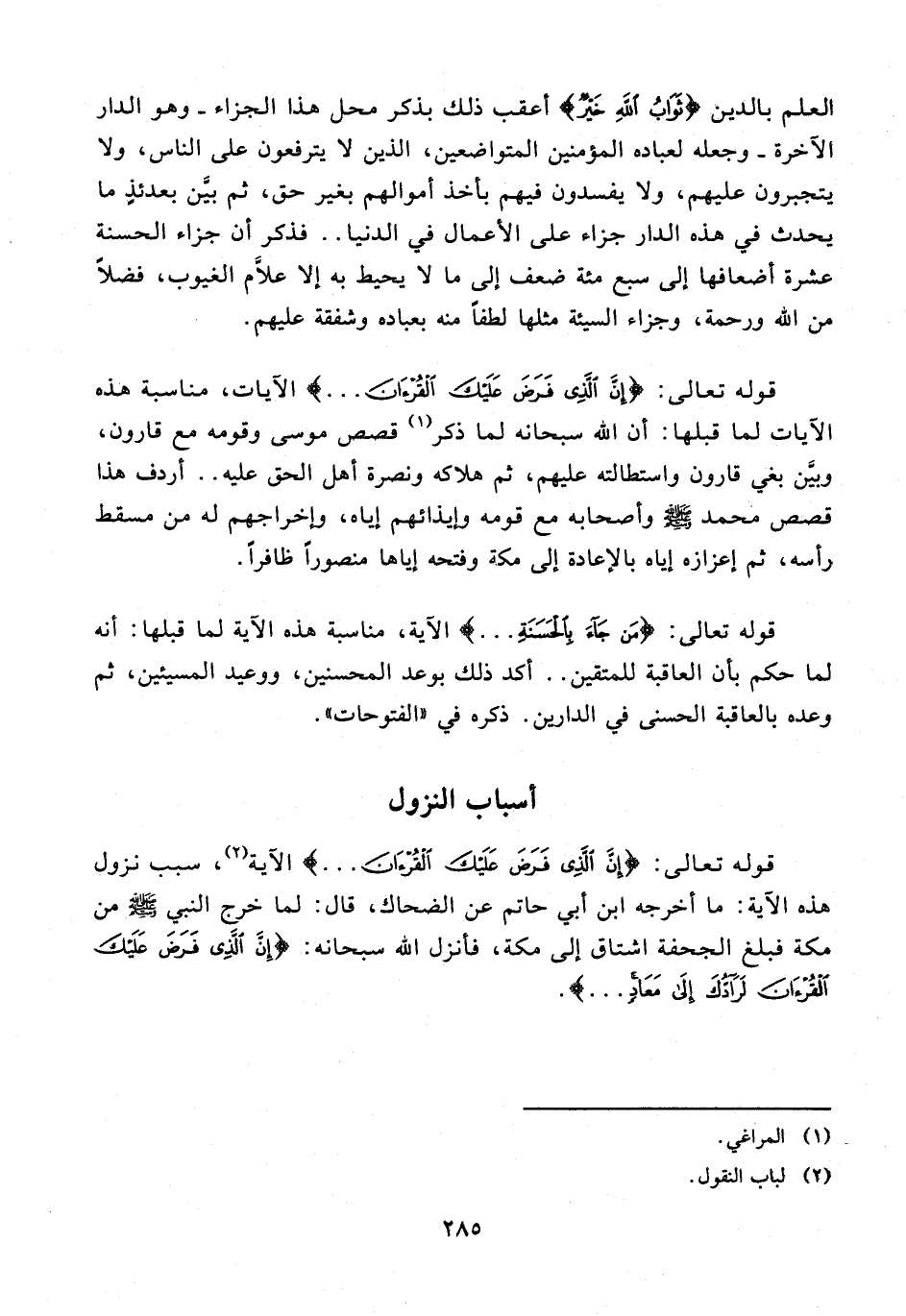 قوله تعالى: {إِنَّ الَّذِي فَرَضَ عَلَيْكَ الْقُرْآنَ ...} الآية (¬2)، سبب نزول هذه الآية: ما أخرجه ابن أبي حاتم عن الضحاك، قال: لما خرج النبي - صلى الله عليه وسلم - من مكة فبلغ الجحفة اشتاق إلى مكة، فأنزل الله سبحانه: {إِنَّ الَّذِي فَرَضَ عَلَيْكَ الْقُرْآنَ لَرَادُّكَ إِلَى مَعَادٍ ...}.