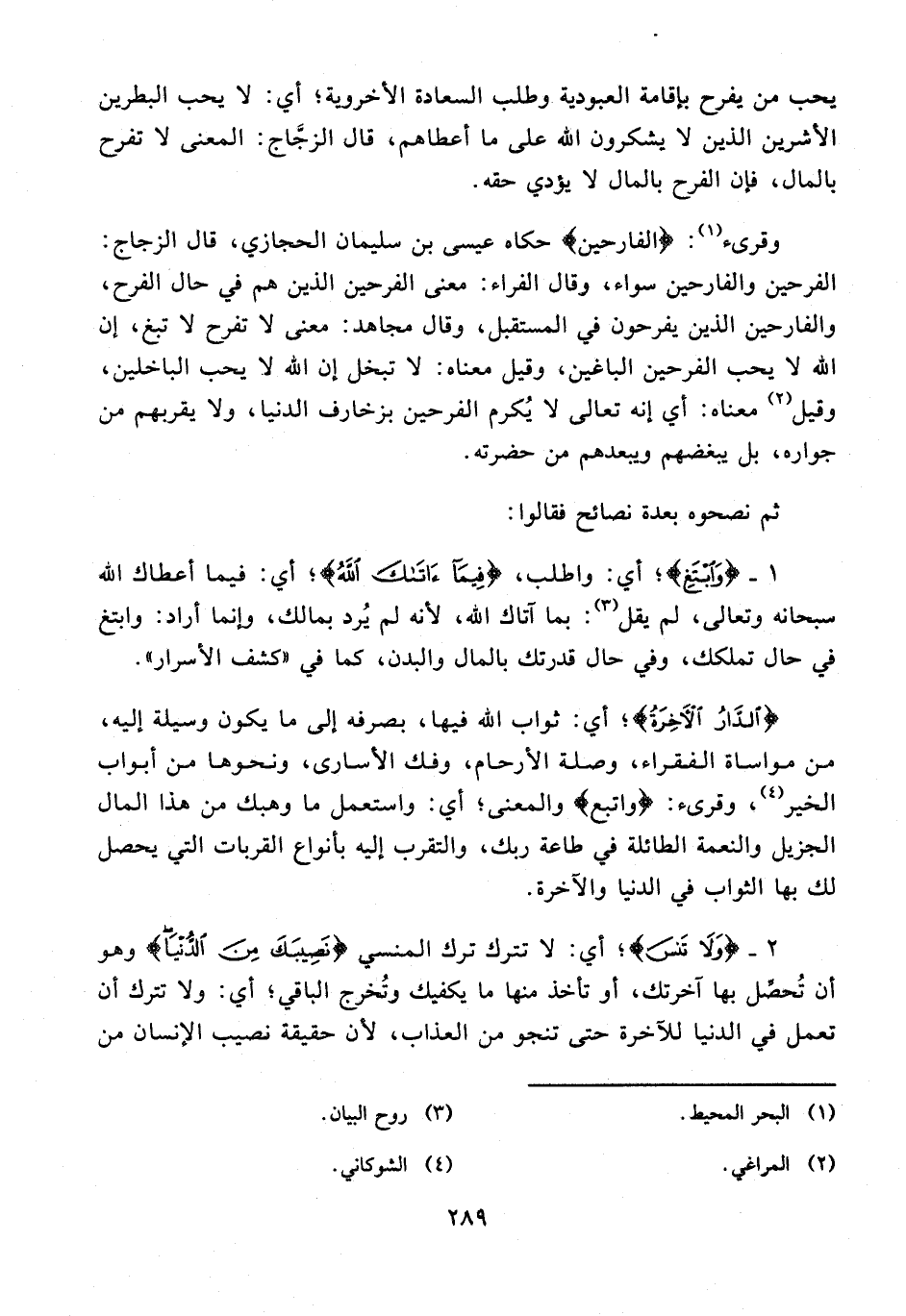 2 - {وَلَا تَنْسَ}؛ أي: لا تترك ترك المنسي {نَصِيبَكَ مِنَ الدُّنْيَا} وهو أن تُحصِّل بها آخرتك، أو تأخذ منها ما يكفيك وتُخرج الباقي؛ أي: ولا تترك أن تعمل في الدنيا للآخرة حتى تنجو من العذاب؛ لأن حقيقة نصيب الإنسان من