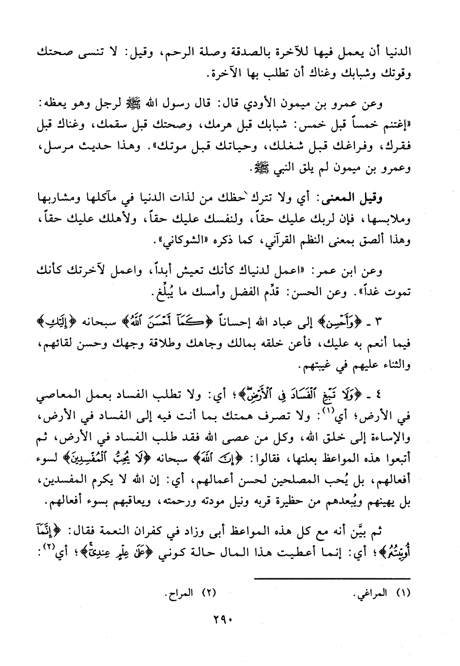 3 - {وَأَحْسِنْ} إلى عباد الله إحسانًا {كَمَا أَحْسَنَ اللَّهُ} سبحانه {إِلَيْكَ} فيما أنعم به عليك، فأعن خلقه بمالك وجاهك وطلاقة وجهك وحسن لقائهم، والثناء عليهم في غيبتهم.