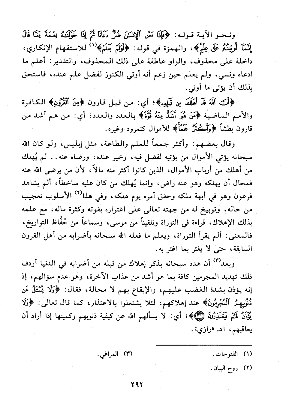 وقال بعضهم: وأكثر جمعًا للعلم والطاعة، مثل إبليس، ولو كان الله سبحانه يؤتي الأموال من يؤتيه لفضل فيه، وخير عنده، ورضاه عنه .. لم يُهلك من أهلك من أرباب الأموال، الذين كانوا أكثر منه مالًا؛ لأن من يرضي الله عنه فمحال أن يهلكه وهو عنه راض، وإنما يُهلك من كان عليه ساخطًا، ألم يشاهد فرعون وهو في أبهة ملكه وحقق أمره يوم هلكه، وفي هذا (¬2) الأسلوب تعجيب من حاله، وتوبيخ له من جهته تعالى على اغتراره بقوته وكثرة ماله، مع علمه بذلك الإهلاك، قراءة في التوراة وتلقينًا من موسى، وسماعًا من حُفَّاظ التواريخ، فالمعنى: ألم يقرأ التوراة، ويعلم ما فعله الله سبحانه بأضرابه من أهل القرون السابقة، حتى لا يغتر بما اغتر به.