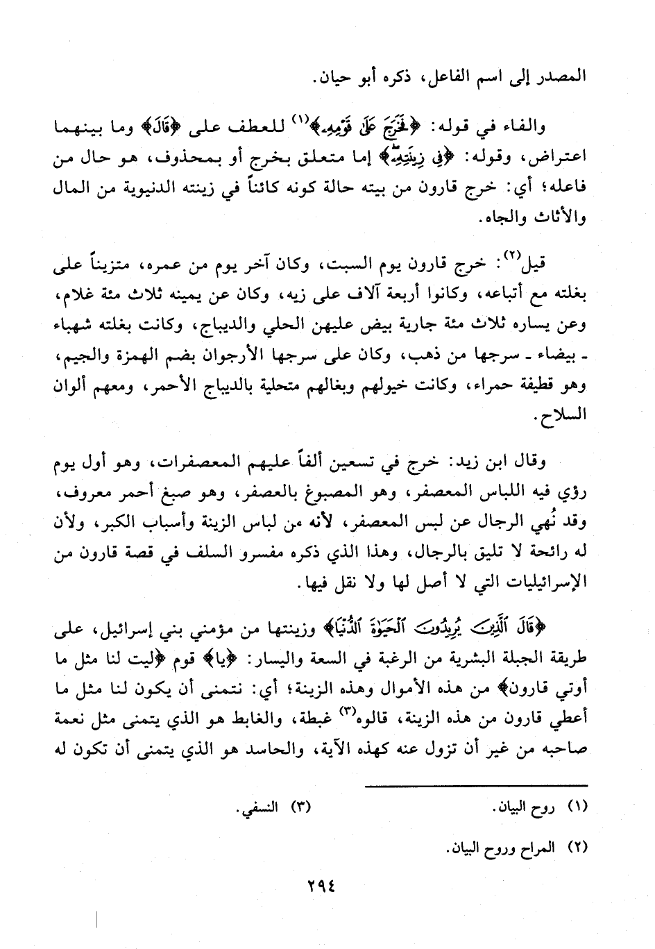 79 - والفاء في قوله: {فَخَرَجَ عَلَى قَوْمِه} (¬1) للعطف على {قَالَ} وما بينهما اعتراض، وقوله: {فِي زِينَتِهِ} إما متعلق بخرج أو بمحذوف، هو حال من فاعله؛ أي: خرج قارون من بيته حالة كونه كائنًا في زينته الدنيوية من المال والأثاث والجاه.