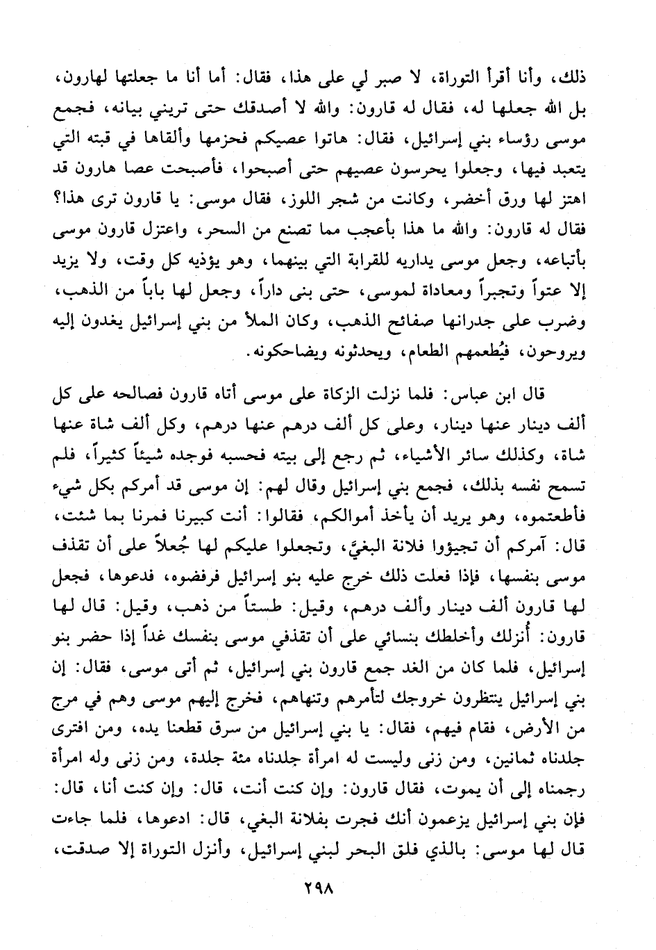ذلك، وأنا أقرأ التوراة، لا صبر لي على هذا، فقال؛ أما أنا ما جعلتها لهارون، بل الله جعلها له، فقال له قارون: والله لا أصدقك حتى تريني بيانه، فجمع موسى رؤساء بني إسرائيل، فقال: هاتوا عصيكم فحزمها وألقاها في قبته التي يتعبد فيها، وجعلوا يحرسون عصيهم حتى أصبحوا، فأصبحت عصا هارون قد اهتز لها ورق أخضر، وكانت من شجر اللوز، فقال موسى: يا قارون ترى هذا؟ فقال له قارون: والله ما هذا بأعجب مما تصنع من السحر، واعتزل قارون موسى باتباعه، وجعل موسى يداريه للقرابة التي بينهما، وهو يؤذيه كل وقت، ولا يزيد إلا عتوًا وتجبرًا ومعاداة لموسى، حتى بني دارًا، وجعل لها بابًا من الذهب، وضرب على جدرانها صفائح الذهب، وكان الملأ من بني إسرائيل يغدون إليه ويروحون، فيُطعمهم الطعام، ويحدثونه ويضاحكونه.