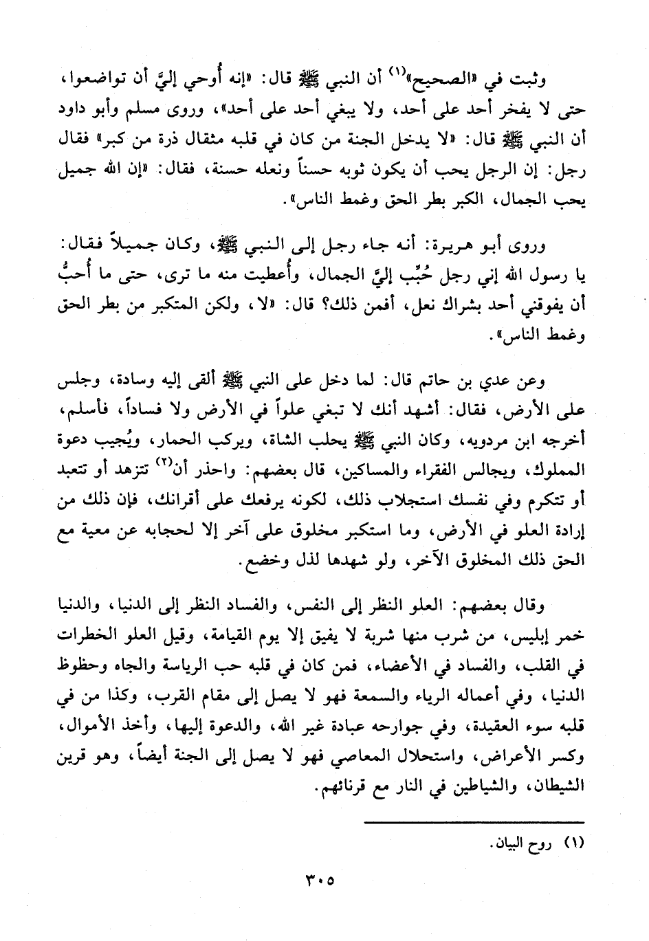 وثبت في "الصحيح" أن النبي - صلى الله عليه وسلم - قال: "إنه أُوحي إليَّ أن تواضعوا، حتى لا يفخر أحد على أحد، ولا يبغي أحد على أحد"، وروى مسلم وأبو داود أن النبي - صلى الله عليه وسلم - قال: "لا يدخل الجنة من كان في قلبه مثقال ذرة من كبر" فقال رجل: إن الرجل يحب أن يكون ثوبه حسنًا ونعله حسنة، فقال: "إن الله جميل يحب الجمال، الكبر بطر الحق وغمط الناس".
