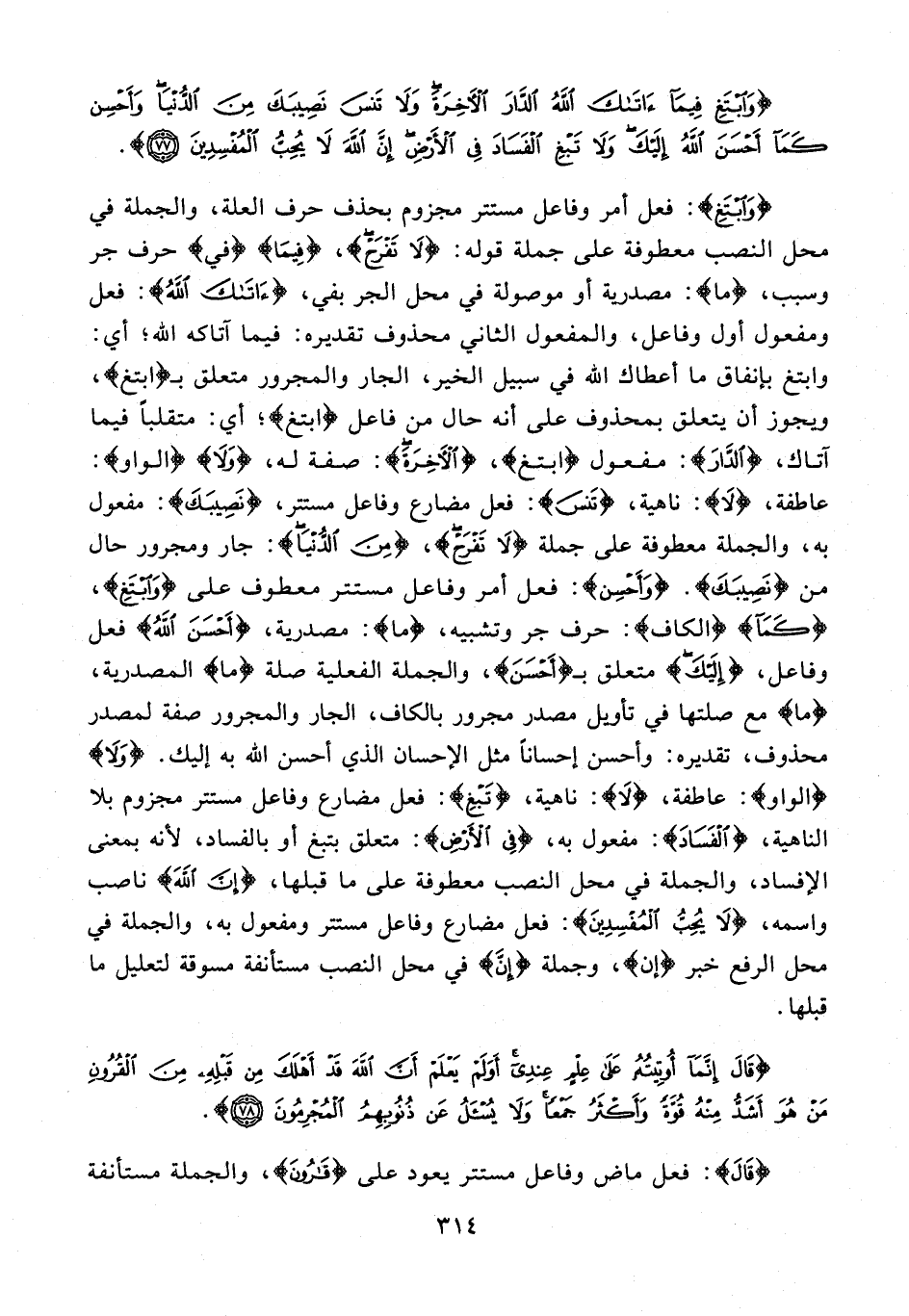 {وَابْتَغِ}: فعل أمر وفاعل مستتر مجزوم بحذف حرف العلة، والجملة في محل النصب معطوفة على جملة قوله: {لَا تَفْرَحْ}، {فِيمَا} {في} حرف جر وسبب، {ما}: مصدرية أو موصولة في محل الجر بفي، {آتَاكَ اللَّهُ}: فعل ومفعول أول وفاعل، والمفعول الثاني محذوف تقديره: فيما آتاكه الله؛ {ابْتَغِ}: وابتغ بإنفاق ما أعطاك الله في سبيل الخير، الجار والمجرور متعلق بـ {ابْتَغِ}، ويجوز أن يتعلق بمحذوف على أنه حال من فاعل {ابْتَغِ}؛ أي: متقلبًا فيما آتاك، {الدَّارَ}: مفعول {ابْتَغِ}، {الْآخِرَةَ}: صفة له، {وَلَا} {الواو}: عاطفة، {لَا}: ناهية، {تَنْسَ}: فعل مضارع وفاعل مستتر، {نَصِيبَكَ}: مفعول به، والجملة معطوفة على جملة {لَا تَفْرَحْ}، {مِنَ الدُّنْيَا}: جار ومجرور حال من {نَصِيبَكَ}. {وَأَحْسِنْ}: فعل أمر وفاعل مستتر معطوف على {وَابْتَغِ}، {كَمَا} {الكاف}: حرف جر وتشبيه، {ما}: مصدرية، {أَحْسَنَ اللَّهُ} فعل وفاعل، {إِلَيْكَ} متعلق بـ {أَحْسِنْ}، والجملة الفعلية صلة {ما} المصدرية، {ما} مع صلتها في تأويل مصدر مجرور بالكاف، الجار والمجرور صفة لمصدر محذوف، تقديره: وأحسن إحسانًا مثل الإحسان الذي أحسن الله به إليك. {وَلَا} {الواو}: عاطفة، {لَا}: ناهية، {تَبْغِ}: فعل مضارع وفاعل مستتر مجزوم بلا الناهية، {الْفَسَادَ}: مفعول به، {فِي الْأَرْضِ}: متعلق بتبغ أو بالفساد؛ لأنه بمعنى الإفساد، والجملة في محل النصب معطوفة على ما قبلها، {إِنَّ اللَّهَ} ناصب واسمه، {لَا يُحِبُّ الْمُفْسِدِينَ}: فعل مضارع وفاعل مستتر ومفعول به، والجملة في محل الرفع خبر {إن}، وجملة {إنَّ} في محل النصب مستأنفة مسوقة لتعليل ما قبلها.