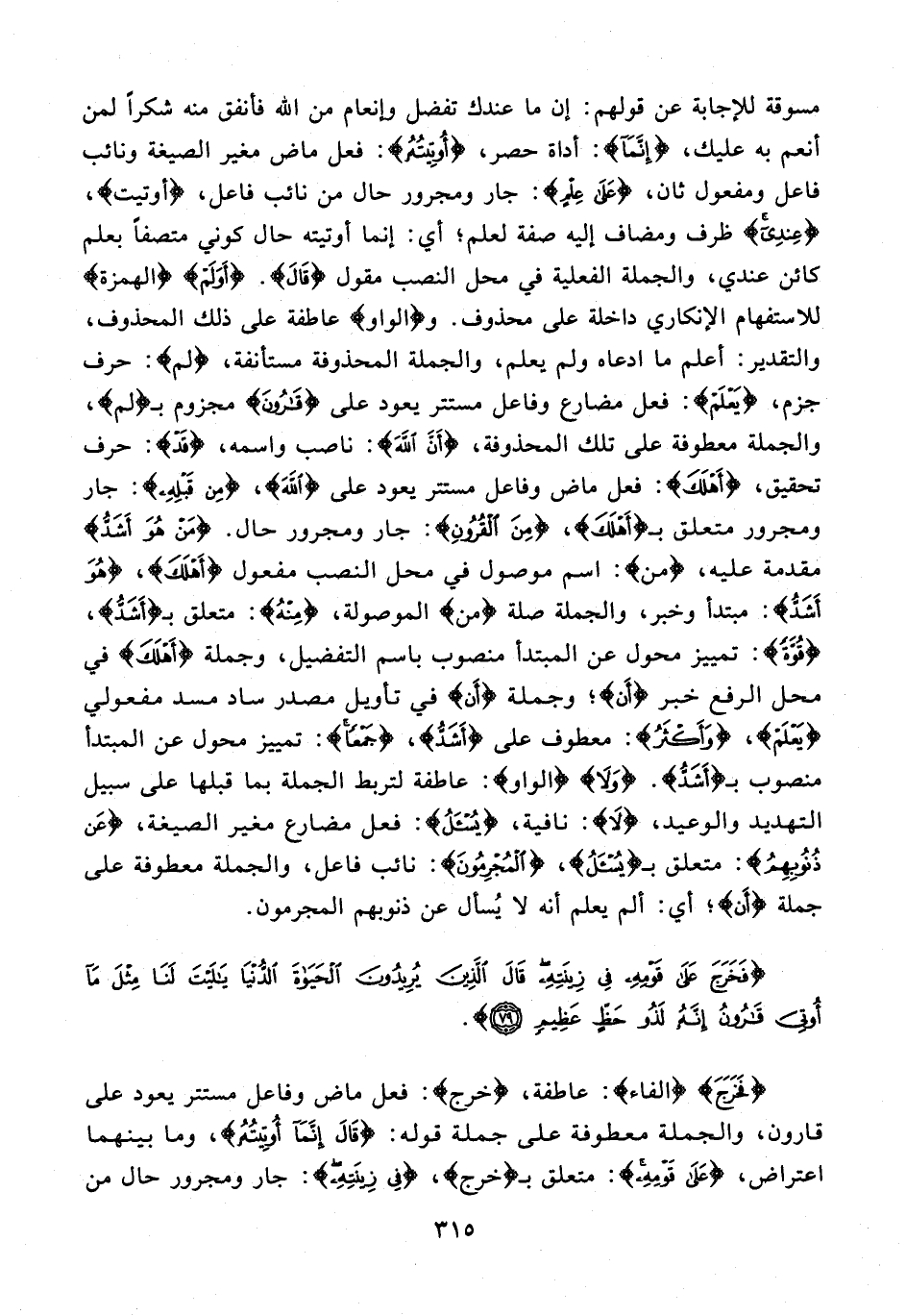 مسوقة للإجابة عن قولهم: إن ما عندك تفضل وإنعام من الله فأنفق منه شكرًا لمن أنعم به عليك، {إِنَّمَا}: أداة حصر، {أُوتِيتُهُ}: فعل ماض مغير الصيغة ونائب فاعل ومفعول ثان، {عَلَى عِلْمٍ}: جار ومجرور حال من نائب فاعل، {أوتيت}، {عِنْدِي} ظرف ومضاف إليه صفة لعلم؛ أي: إنما أوتيته حال كوني متصفًا بعلم كائن عندي، والجملة الفعلية في محل النصب مقول {قَالَ}. {أَوَلَمْ} {الهمزة} للاستفهام الإنكاري داخلة على محذوف. و {الواو} عاطفة على ذلك المحذوف، والتقدير: أعلم ما ادعاه ولم يعلم، والجملة المحذوفة مستأنفة، {لَمْ}: حرف جزم، {يَعْلَمْ}: فعل مضارع وفاعل مستتر يعود على {قَارُونَ} مجزوم بـ {لم}، والجملة معطوفة على تلك المحذوفة، {أَنَّ اللَّه}: ناصب واسمه، {قَدْ}: حرف تحقيق، {أَهْلَكَ}: فعل ماض وفاعل مستتر يعود على {اللَّهَ}، {مِنْ قَبْلِهِ}: جار ومجرور متعلق بـ {أَهْلَكَ}، {مِنَ الْقُرُونِ}: جار ومجرور حال. {مَنْ هُوَ أَشَدُّ} مقدمة عليه، {مَنْ}: اسم موصول في محل النصب مفعول {أَهْلَكَ}، {هُوَ أَشَدُّ}: مبتدأ وخبر، والجملة صلة {مَنْ} الموصولة، {مِنْهُ}: متعلق بـ {أَشَدُّ}، {قُوَّةً}: تمييز محول عن المبتدأ منصوب باسم التفضيل، وجملة {أَهْلَكَ} في محل الرفع خبر {أَنَّ}؛ وجملة {أَنَّ} في تأويل مصدر ساد مسد مفعولي {يَعْلَمْ}، {وَأَكْثَرُ}: معطوف على {أَشَدُّ}، {جَمْعًا}: تمييز محول عن المبتدأ منصوب بـ {أَشَدُّ}. {وَلَا} {الواو}: عاطفة لتربط الجملة بما قبلها على سبيل التهديد والوعيد، {لَا}: نافية، {يُسْأَلُ}: فعل مضارع مغير الصيغة، {عَنْ ذُنُوبِهِمُ}: متعلق بـ {يُسْئلُ}، {الْمُجْرِمُونَ}: نائب فاعل، والجملة معطوفة على جملة {أَنَّ}؛ أي: ألم يعلم أنه لا يُسأل عن ذنوبهم المجرمون.
