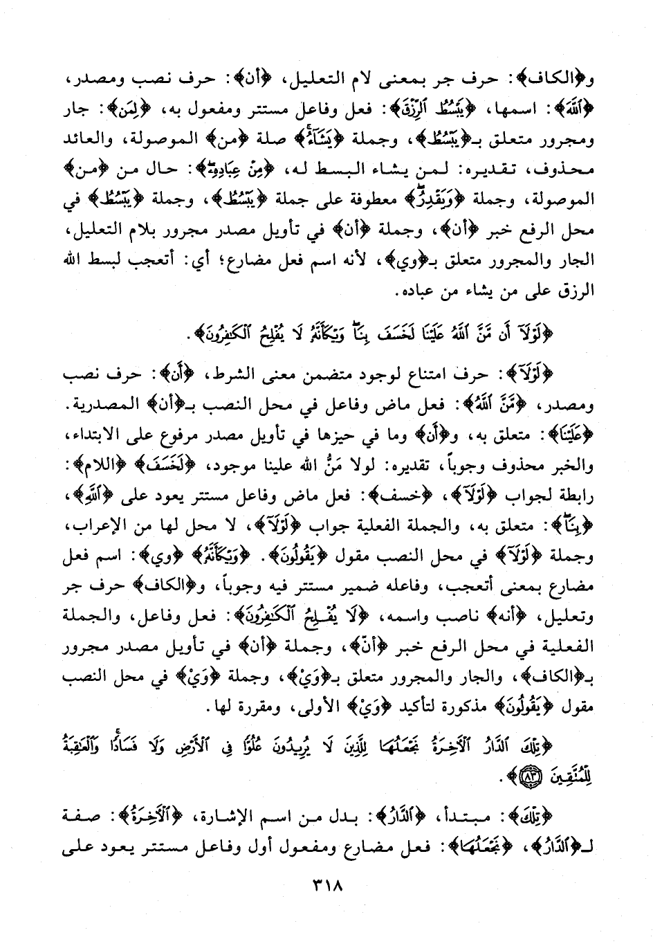 {لَوْلَا} حرف امتناع لوجود متضمن معنى الشرط، {أَنْ}: حرف نصب ومصدر، {مَنَّ اللَّهُ}: فعل ماض وفاعل في محل النصب بـ {أن} المصدرية. {عَلَيْنَا}: متعلق به، و {أَن} وما في حيزها في تأويل مصدر مرفوع على الابتداء، والخبر محذوف وجوبًا، تقديره: لولا مَنُّ الله علينا موجود، {لَخَسَفَ} {اللام}: رابطة لجواب {لَوْلَا}، {خَسَفَ}: فعل ماض وفاعل مستتر يعود على {اللَّهُ}، {بِنَا}: متعلق به، والجملة الفعلية جواب {لَوْلَا}، لا محل لها من الإعراب، وجملة {لَوْلَا} في محل النصب مقول {يَقُولُونَ}. {وَيْكَأَنَّ} {وي}: اسم فعل مضارع بمعنى أتعجب، وفاعله ضمير مستتر فيه وجوبًا، و {الكاف} حرف جر وتعليل، {أَنَّهُ} ناصب واسمه، {لَا يُفْلِحُ الْكَافِرُونَ}: فعل وفاعل، والجملة الفعلية في محل الرفع خبر {أَنّ}، وجملة {أن} في تأويل مصدر مجرور بـ {الكاف}، والجار والمجرور متعلق بـ {وَيْ}، وجملة {وَيْ} في محل النصب مقول {يَقُولُونَ} مذكورة لتأكيد {وَيْ} الأولى، ومقررة لها.