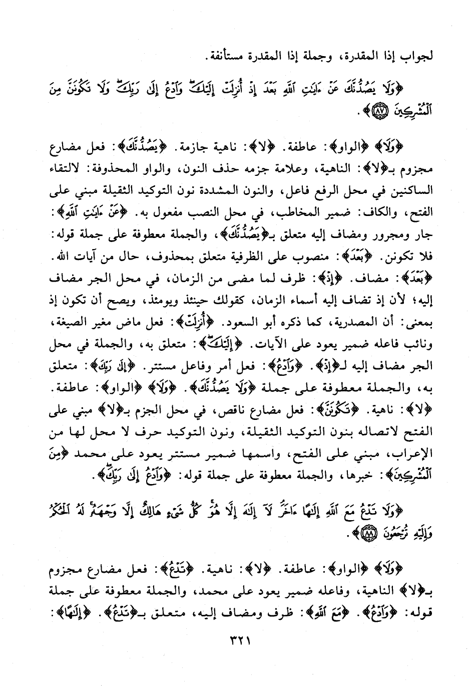 {وَلَا} {الواو}: عاطفة. {لا}: ناهية جازمة. {يَصُدُّنَّكَ}: فعل مضارع مجزوم بـ {لا}: الناهية، وعلامة جزمه حذف النون، والواو المحذوفة: لالتقاء الساكنين في محل الرفع فاعل، والنون المشددة نون التوكيد الثقيلة مبني على الفتح، والكاف: ضمير المخاطب، في محل النصب مفعول به. {عَنْ آيَاتِ اللَّهِ}: جار ومجرور ومضاف إليه متعلق بـ {يَصُدُّنَّكَ}، والجملة معطوفة على جملة قوله: فلا تكونن. {بَعْدَ}: منصوب على الظرفية متعلق بمحذوف، حال من آيات الله. {بَعْدَ}: مضاف. {إِذْ}: ظرف لما مضى من الزمان، في محل الجر مضاف إليه؛ لأن إذ تضاف إليه أسماء الزمان، كقولك حينئذ ويومئذ، ويصح أن تكون إذ بمعنى: أن المصدرية، كما ذكره أبو السعود. {أُنْزِلَتْ}: فعل ماض مغير الصيغة، ونائب فاعله ضمير يعود على الآيات. {إِلَيْكَ}: متعلق به، والجملة في محل الجر مضاف إليه لـ {إِذْ}. {وَادْعُ}: فعل أمر وفاعل مستتر. {إِلَى رَبِّكَ}: متعلق به، والجملة معطوفة على جملة {وَلَا يَصُدُّنَّكَ}. {وَلَا} {الواو}: عاطفة. {لَا}: ناهية. {تَكُونَنَّ}: فعل مضارع ناقص، في محل الجزم بـ {لا} مبني على الفتح لاتصاله بنون التوكيد الثقيلة، ونون التوكيد حرف لا محل لها من الإعراب، مبني على الفتح، واسمها ضمير مستتر يعود على محمد {مِنَ الْمُشْرِكِينَ}: خبرها، والجملة معطوفة على جملة قوله: {وَادْعُ إِلَى رَبِّكَ}.