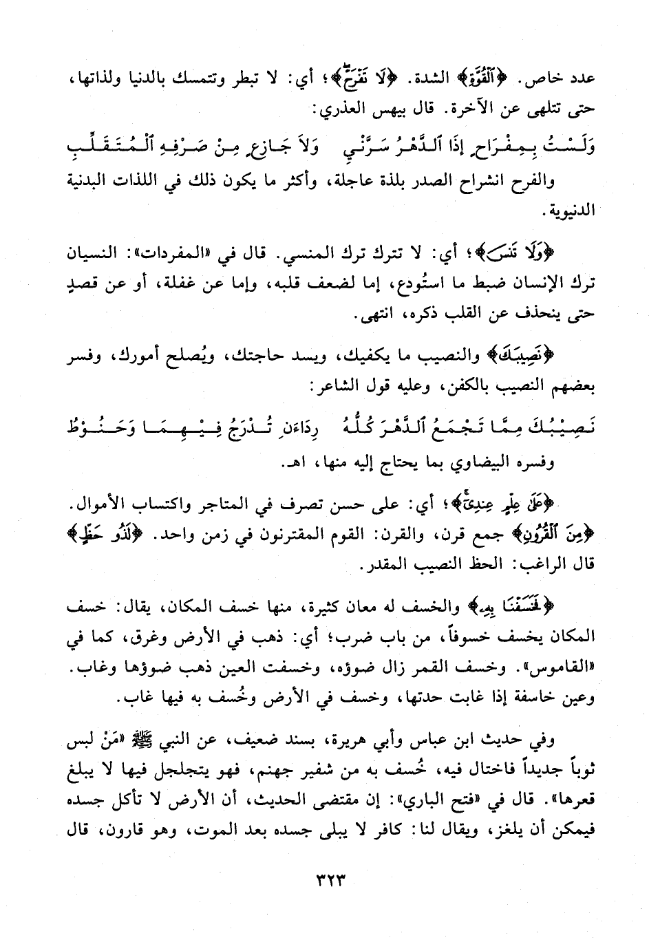 وفي حديث ابن عباس وأبي هريرة، بسند ضعيف، عن النبي - صلى الله عليه وسلم - "مَنْ لبس ثوبًا جديدًا فاختال فيه، خُسف به من شفير جهنم، فهو يتجلجل فيها لا يبلغ قعرها. قال في "فتح الباري": إن مقتضى الحديث، أن الأرض لا تأكل جسده فيمكن أن يلغز، ويقال لنا: كافر لا يبلى جسده بعد الموت، وهو قارون، قال