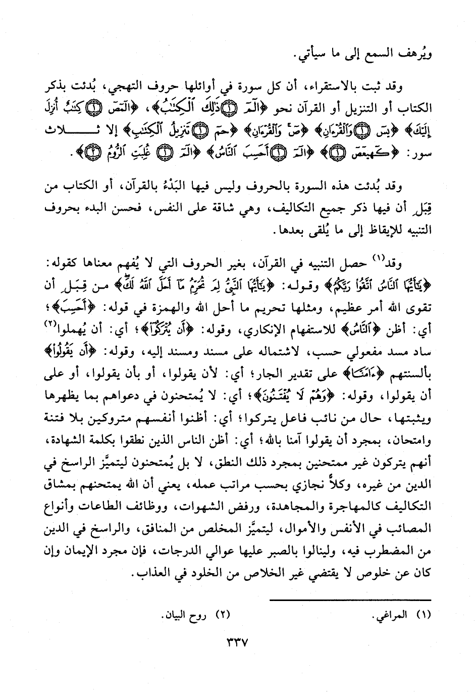 وقد ثبت بالاستقراء، أن كل سورة في أوائلها حروف التهجي، بُدئت بذكر الكتاب أو التنزيل أو القرآن نحو {الم (1) ذَلِكَ الْكِتَابُ}، {المص (1) كِتَابٌ أُنْزِلَ إِلَيْكَ} {يس (1) وَالْقُرْآنِ} {ص وَالْقُرْآنِ} {حم (1) تَنْزِيلُ الْكِتَابِ} إلا ثلاث سور: {كهيعص (1)} {الم (1) أَحَسِبَ النَّاسُ} {الم (1) غُلِبَتِ الرُّومُ (2)}.