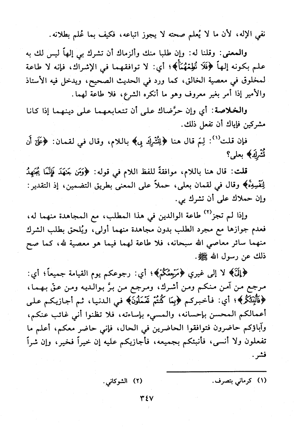 وإذا لم تجز (¬2) طاعة الوالدين في هذا المطلب، مع المجاهدة منهما له، فعدم جوازها مع مجرد الطلب بدون مجاهدة منهما أولى، ويُلحق بطلب الشرك منهما سائر معاصي الله سبحانه، فلا طاعة لهما فيما هو معصية لله، كما صح ذلك عن رسول الله - صلى الله عليه وسلم -.