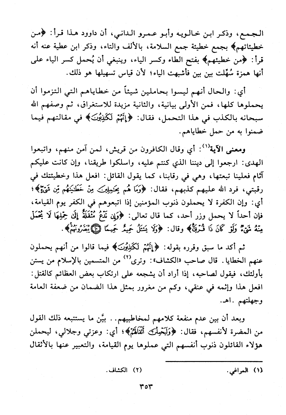 ثم أكد ما سبق وقرره بقوله: {إِنَّهُمْ لَكَاذِبُونَ} فيما قالوا من أنهم يحملون عنهم الخطايا. قال صاحب "الكشاف": وترى (¬2) من المتسمين بالإِسلام من يستن بأولئك، فيقول لصاحبه، إذا أراد أن يشجعه على ارتكاب بعض العظائم كالقتل: افعل هذا وإثمه في عنقي، وكم من مغرور بمثل هذا الضمان من ضعفة العامة وجهلتهم. اهـ.