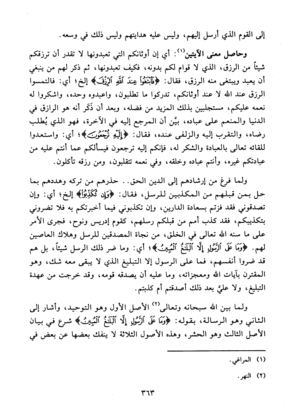 19 - ولما بين الله سبحانه وتعالى (¬2) الأصل الأول وهو التوحيد، وأشار إلى الثاني وهو الرسالة، بقوله: {وَمَا عَلَى الرَّسُولِ إِلَّا الْبَلَاغُ الْمُبِينُ} شرع في بيان الأصل الثالث وهو الحشر، وهذه الأصول الثلاثة لا ينفك بعضها عن بعض في