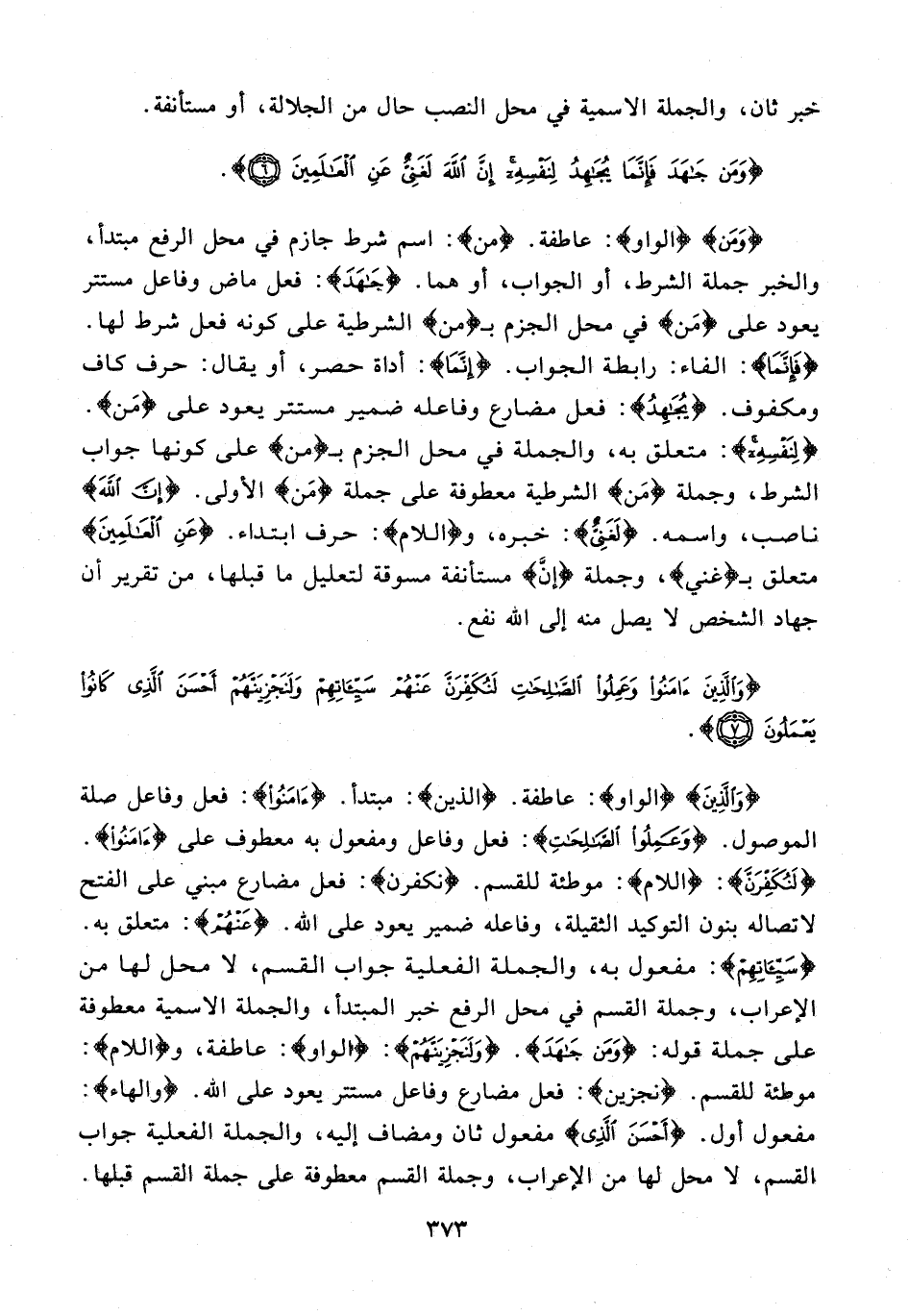 {وَمَنْ} {الواو} عاطفة. {مَنْ}: اسم شرط جازم في محل الرفع مبتدأ، والخبر جملة الشرط، أو الجواب، أو هما. {جَاهَدَ}: فعل ماض وفاعل مستتر يعود على {مَنْ} في محل الجزم بـ {من} الشرطية على كونه فعل شرط لها. {فَإِنَّمَا}: الفاء: رابطة الجواب. {إِنَّمَا}: أداة حصر، أو يقال: حرف كاف ومكفوف. {يُجَاهِدُ}: فعل مضارع وفاعله ضمير مستتر يعود على {مَنْ}. {لِنَفْسِهِ}: متعلق به، والجملة في محل الجزم بـ {من} على كونها جواب الشرط، وجملة {مَنْ} الشرطية معطوفة على جملة {مَنْ} الأولى. {إِنَّ اللَّهَ} ناصب، واسمه. {لَغَنِيٌّ}: خبره، و {اللام}: حرف ابتداء. {عَنِ الْعَالَمِينَ} متعلق بـ {غَنِيٌّ}، وجملة {إنَّ} مستأنفة مسوقة لتعليل ما قبلها، من تقرير أن جهاد الشخص لا يصل منه إلى الله نفع.