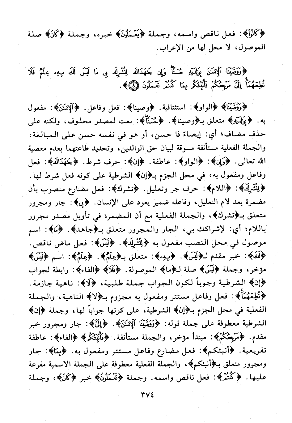 {وَوَصَّيْنَا} {الواو}: استئنافية. {وَصَّيْنَا}: فعل وفاعل. {الْإِنْسَانَ}: مفعول به. {بِوَالِدَيْهِ} متعلق بـ {وَصَّيْنَا}. {حُسْنًا}: نعت لمصدر محذوف، ولكنه على حذف مضاف؛ أي: إيصاءً ذا حسن، أو هو في نفسه حسن على المبالغة، والجملة الفعلية مستأنفة مسوقة لبيان حق الوالدين، وتحديد طاعتهما بعدم معصية الله تعالى. {وَإِنْ}: {الواو}: عاطفة. {إن}: حرف شرط. {جَاهَدَاكَ}: فعل وفاعل ومفعول به، في محل الجزم بـ {إن} الشرطية على كونه فعل شرط لها. {لِتُشْرِكَ}: {اللام}: حرف جر وتعليل. {تُشْرِكَ}: فعل مضارع منصوب بأن مضمرة بعد لام التعليل، وفاعله ضمير يعود على الإنسان. {بِي}: جار ومجرور متعلق بـ {تُشْرِكَ}، والجملة الفعلية مع أن المضمرة في تأويل مصدر مجرور باللام؛ أي: لإشراكك بي، الجار والمجرور متعلق بـ {جَاهَدَ}. {مَا}: اسم موصول في محل النصب مفعول به {لِتُشْرِكَ}. {لَيْسَ}: فعل ماض ناقص. {لَكَ}: خبر مقدم لـ {لَيْسَ}. {بِهِ}: متعلق بـ {عِلْمٌ}. {عِلْمٌ}: اسم {لَيْسَ} مؤخر، وجملة {لَيْسَ} صلة لـ {ما} الموصولة. {فَلَا} {الفاء}: رابطة لجواب {إِنْ} الشرطية وجوبًا لكون الجواب جملة طلبية، {لَا}: ناهية جازمة. {تُطِعْهُمَا}: فعل وفاعل مستتر ومفعول به مجزوم بـ {لَا} الناهية، والجملة الفعلية في محل الجزم بـ {إن} الشرطية، على كونها جوابًا لها، وجملة {إن} الشرطية معطوفة على جملة قوله: {وَوَصَّيْنَا الْإِنْسَانَ}. {إِلَيَّ}: جار ومجرور خبر مقدم. {مَرْجِعُكُمْ}: مبتدأ مؤخر، والجملة مستأنفة. {فَأُنَبِّئُكُمْ} {الفاء}: عاطفة تفريعية. {أُنَبِّئُكُمْ}: فعل مضارع وفاعل مستتر ومفعول به. {بِمَا}: جار وجرور متعلق بـ {أُنَبِّئُكُم}، والجملة الفعلية معطوفة على الجملة الاسمية مفرعة عليها. {كُنْتُمْ}: فعل ناقص واسمه. وجملة {تَعْمَلُونَ} خبر {كَان}، وجملة