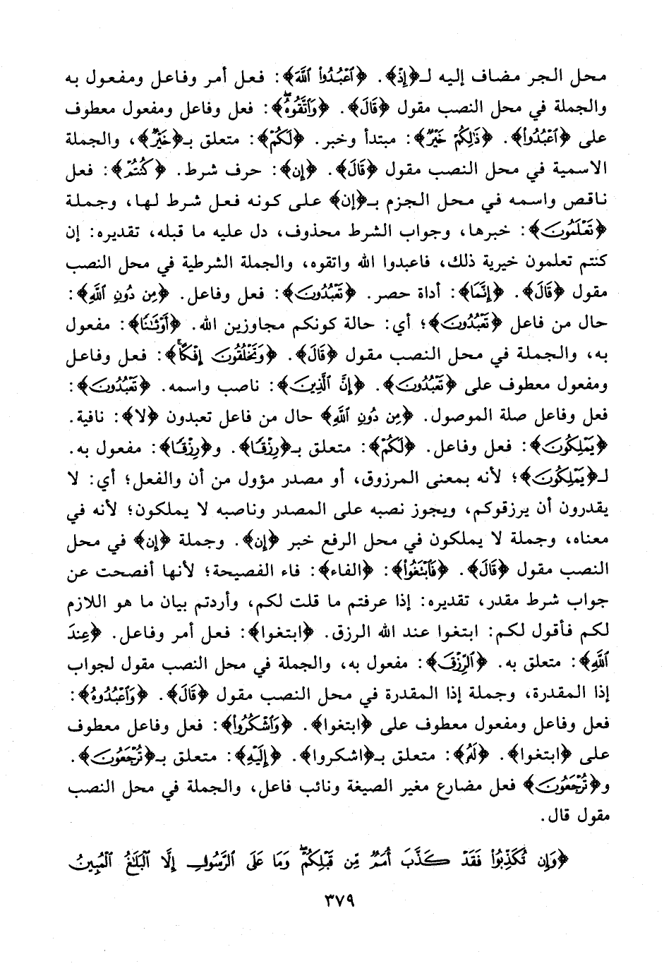 محل الجر مضاف إليه لـ {إِذْ}. {اعْبُدُوا اللَّهَ}: فعل أمر وفاعل ومفعول به والجملة في محل النصب مقول {قَالَ}. {وَاتَّقُوهُ}: فعل وفاعل ومفعول معطوف على {اعْبُدُوا}. {ذَلِكُمْ خَيْرٌ} مبتدأ وخبر. {لَكُمْ}: متعلق بـ {خَيْرٌ}، والجملة الاسمية في محل النصب مقول {قَالَ}. {إن}: حرف شرط. {كُنْتُمْ}: فعل ناقص واسمه في محل الجزم بـ {إن} على كونه فعل شرط لها، وجملة {تَعْلَمُونَ}: خبرها، وجواب الشرط محذوف، دل عليه ما قبله، تقديره: إن كنتم تعلمون خيرية ذلك، فاعبدوا الله واتقوه، والجملة الشرطية في محل النصب مقول {قَالَ}. {إِنَّمَا}: أداة حصر. {تَعْبُدُونَ}: فعل وفاعل. {مِنْ دُونِ اللَّهِ}: حال من فاعل {تَعْبُدُونَ}؛ أي: حالة كونكم مجاوزين الله. {أَوْثَانًا}: مفعول به، والجملة في محل النصب مقول {قَالَ}. {وَتَخْلُقُونَ إِفْكًا}: فعل وفاعل ومفعول معطوف على {تَعْبُدُونَ}. {إِنَّ الَّذِينَ}: ناصب واسمه. {تَعْبُدُونَ}: فعل وفاعل صلة الموصول. {مِنْ دُونِ اللَّهِ} حال من فاعل تعبدون {لَا}: نافية. {يَمْلِكُونَ}: فعل وفاعل. {لَكُمْ}: متعلق بـ {رِزْقًا}. و {رِزْقًا}: مفعول به. لـ {يَمْلِكُونَ}؛ لأنه بمعنى المرزوق، أو مصدر مؤول من أن والفعل؛ أي: لا يقدرون أن يرزقوكم، ويجوز نصبه على المصدر وناصبه لا يملكون؛ لأنه في معناه، وجملة لا يملكون في محل الرفع خبر {إن}. وجملة {إن} في محل النصب مقول {قَالَ}. {فَابْتَغُوا}: {الفاء}: فاء الفصيحة؛ لأنها أفصحت عن جواب شرط مقدر، تقديره: إذا عرفتم ما قلت لكم، وأردتم بيان ما هو اللازم لكم فأقول لكم: ابتغوا عند الله الرزق. {ابْتَغُوا}: فعل أمر وفاعل. {عِنْدَ اللَّهِ}: متعلق به. {الرِّزْقَ}: مفعول به، والجملة في محل النصب مقول لجواب إذا المقدرة، وجملة إذا المقدرة في محل النصب مقول {قَالَ}. {اعْبُدُوا}: فعل وفاعل ومفعول معطوف على {ابْتَغُوا}. {وَاشْكُرُوا}: فعل وفاعل معطوف على {ابْتَغُوا}. {لَهُ}: متعلق بـ {اشكروا}. {إِلَيْهِ}: متعلق بـ {تُرْجَعُونَ}. و {تُرْجَعُونَ} فعل مضارع مغير الصيغة ونائب فاعل، والجملة في محل النصب مقول قال.