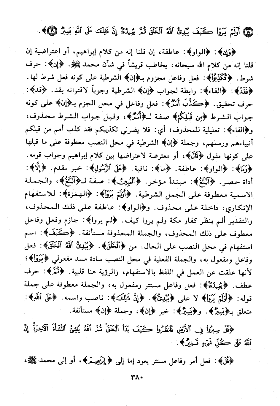{وَإِنْ}: {الواو}: عاطفة، إن قلنا إنه من كلام إبراهيم، أو اعتراضية إن قلنا إنه من كلام الله سبحانه، يخاطب قريشًا في شأن محمد - صلى الله عليه وسلم -. {إن}: حرف شرط. {تُكَذِّبُوا}: فعل وفاعل مجزوم بـ {إن} الشرطية على كونه فعل شرط لها. {فَقَدْ}: {الفاء}: رابطة لجواب {إن} الشرطية وجوبًا لاقترانه بقد. {قَدْ}: حرف تحقيق. {كَذَّبَ أُمَمٌ}: فعل وفاعل في محل الجزم بـ {إن} على كونه جواب الشرط {مِنْ قَبْلِكُمْ} صفة لـ {أُمَمٌ}، وقيل جواب الشرط محذوف، و {الفاء}: تعليلية للمحذوف؛ أي: فلا يضرني تكذيبكم فقد كذب أمم من قبلكم أنبياءهم ورسلهم، وجملة {إن} الشرطية في محل النصب معطوفة على ما قبلها على كونها مقول {قَالَ}، أو معترضة لاعتراضها بين كلام إبراهيم وجواب قومه. {وَمَا}: {الواو}: عاطفة. {مَا}: نافية. {عَلَى الرَّسُولِ}: خبر مقدم. {إِلَّا}: أداة حصر. {الْبَلَاغُ}: مبتدأ مؤخر. {الْمُبِينُ}: صفة لـ {الْبَلَاغُ}، والجملة الاسمية معطوفة على الجمل الشرطية. {أَوَلَمْ يَرَوْا}: {الهمزة}: للاستفهام الإتكاري، داخلة على محذوف. و {الواو}: عاطفة على ذلك المحذوف، والتقدير ألم ينظر كفار مكة ولم يروا كيف. {لَمْ يَرَوْا}: جازم وفعل وفاعل معطوف على ذلك المحذوف، والجملة المحذوفة مستأنفة. {كَيْفَ}: اسم استفهام في محل النصب على الحال. من {الْخَلْقَ}. {يُبْدِئُ اللَّهُ الْخَلْقَ}: فعل وفاعل ومفعول به، والجملة الفعلية في محل النصب سادة مسد مفعولي {يَرَوْا}؛ لأنها علقت عن العمل في اللفظ بالاستفهام، والرؤية هنا قلبية. {ثُمَّ}: حرف عطف. {يُعِيدُهُ}: فعل وفاعل مستتر ومفعول به، والجملة معطوفة على جملة قوله: {أَوَلَمْ يَرَوْا} لا على {يُبْدِئُ}. {إِنَّ ذَلِكَ}: ناصب واسمه. {عَلَى اللَّهِ}: متعلق بـ {يَسِيرٌ}. و {يَسِيرٌ}: خبر {إن}، وجملة {إن} مستأنفة.