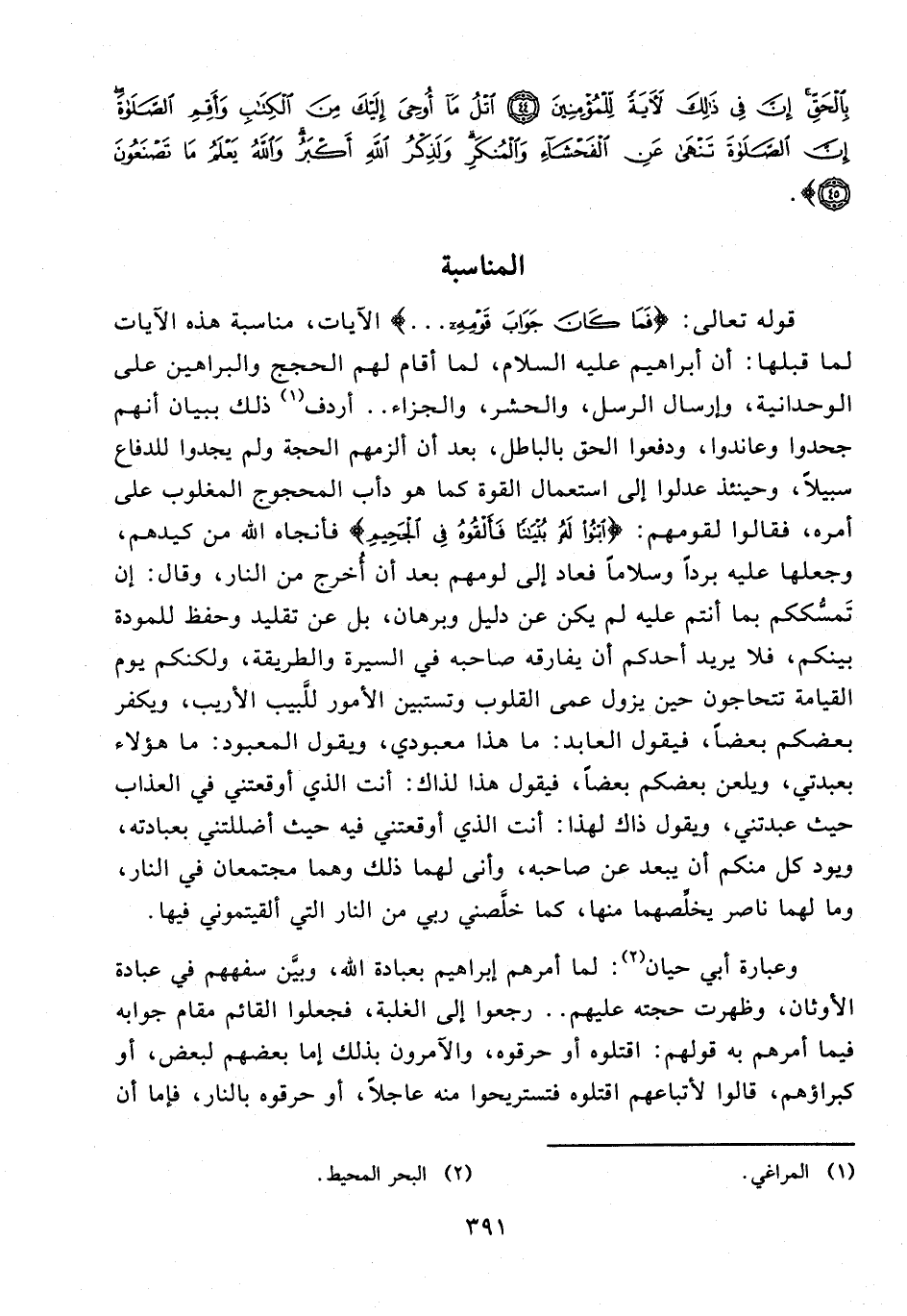 قوله تعالى: {فَمَا كَانَ جَوَابَ قَوْمِهِ ...} الآيات، مناسبة هذه الآيات لما قبلها: أن إبراهيم عليه السلام، لما أقام لهم الحجج والبراهين على الوحدانية، وإرسال الرسل، والحشر، والجزاء .. أردف (¬1) ذلك ببيان أنهم جحدوا وعاندوا، ودفعوا الحق بالباطل، بعد أن ألزمهم الحجة ولم يجدوا للدفاع سبيلًا، وحينئذ عدلوا إلى استعمال القوة كما هو دأب المحجوج المغلوب على أمره، فقالوا لقومهم: {ابْنُوا لَهُ بُنْيَانًا فَأَلْقُوهُ فِي الْجَحِيمِ} فأنجاه الله من كيدهم، وجعلها عليه بردًا وسلامًا فعاد إلى لومهم بعد أن أُخرج من النار، وقال: إن تَمسُّككم بما أنتم عليه لم يكن عن دليل وبرهان، بل عن تقليد وحفظ للمودة بينكم، فلا يريد أحدكم أن يفارقه صاحبه في السيرة والطريقة، ولكنكم يوم القيامة تتحاجون حين يزول عمى القلوب وتستبين الأمور للَّبيب الأريب، ويكفر بعضكم بعضًا، فيقول العابد: ما هذا معبودي، ويقول المعبود: ما هؤلاء بعبدتي، ويلعن بعضكم بعضًا، فيقول هذا لذاك: أنت الذي أوقعتني في العذاب حيث عبدتني، ويقول ذاك لهذا: أنت الذي أوقعتني فيه حيث أضللتني بعبادته، ويود كل منكم أن يبعد عن صاحبه، وأنى لهما ذلك وهما مجتمعان في النار، وما لهما ناصر يخلِّصهما منها، كما خلَّصني ربي من النار التي ألقيتموني فيها.