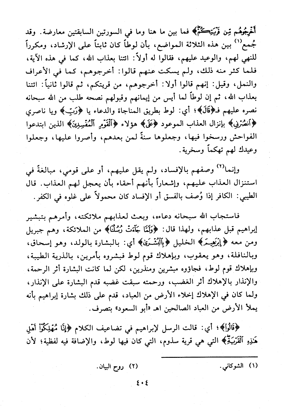 أَخْرِجُوهُمْ مِنْ قَرْيَتِكُمْ} فما بين ما هنا وما في السورتين السابقتين معارضة. وقد جُمع (¬1) بين هذه الثلاثة المواضع، بأن لوطًا كان ثابتًا على الإرشاد، ومكررًا للنهي لهم، والوعيد عليهم، فقالوا له أولًا: ائتنا بعذاب الله، كما في هذه الآية، فلما كثر منه ذلك، ولم يسكت عنهم قالوا: أخرجوهم، كما في الأعراف والنمل، وقيل: إنهم قالوا أولًا: أخرجوهم، من قريتكم، ثم قالوا ثانيًا: ائتنا بعذاب الله،