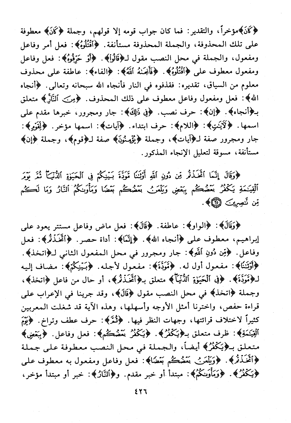 {وَقَالَ}: {الواو}: عاطفة. {قَالَ}: فعل ماض وفاعل مستتر يعود على إبراهيم، معطوف على {أَنْجَاهُ اللَّهُ}. {إِنَّمَا}: أداة حصر. {اتَّخَذْتُمْ}: فعل وفاعل. {مِنْ دُونِ اللَّهِ}: جار ومجرور في محل المفعول الثاني لـ {اتَّخَذْ}. {أَوْثَانًا}: مفعول أول له. {مَوَدَّةَ}: مفعول لأجله. {بَيْنِكُمْ}: مضاف إليه لـ {مَوَدَّةَ}. {فِي الْحَيَاةِ الدُّنْيَا} متعلق بـ {اتَّخَذْتُمْ}، أو حال من فاعل {اتَّخَذْ}، وجملة {اتَّخَذ} في محل النصب مقول {قَالَ}، وقد جرينا في الإعراب على قراءة حفص، واخترنا أمثل الأوجه وأسهلها، وهذه الآية قد شغلت المعربين كثيرًا لاختلاف قرائتها، وجهات النظر فيها. {ثُمَّ}: حرف عطف وتراخ. {يَوْمَ الْقِيَامَةِ}: ظرف متعلق بـ {يَكْفُرُ}. {يَكْفُرُ بَعْضُكُمْ}: فعل وفاعل. {بِبَعْضٍ} متعلق بـ {يَكْفُرُ} أيضًا، والجملة في محل النصب معطوفة على جملة {اتَّخَذْتُمْ}. {وَيَلْعَنُ بَعْضُكُمْ بَعْضًا}: فعل وفاعل ومفعول به معطوف على {يَكْفُرُ} {وَمَأْوَاكُمُ}: مبتدأ أو خبر مقدم. و {النَّارُ}: خبر أو مبتدأ مؤخر،