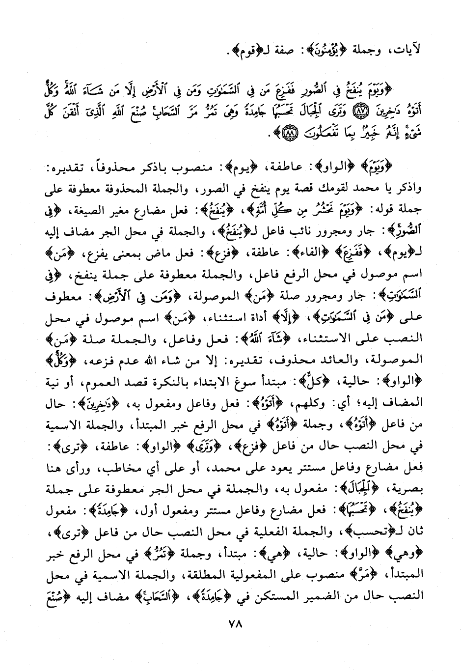 {وَيَوْمَ} {الواو}: عاطفة، {يَوْمَ}: منصوب باذكر محذوفًا، تقديره: واذكر يا محمد لقومك قصة يوم ينفخ في الصور، والجملة المحذوفة معطوفة على جملة قوله: {وَيَوْمَ نَحْشُرُ مِنْ كُلِّ أُمَّةٍ}، {يُنْفَخُ}: فعل مضارع مغير الصيغة، {فِي الصُّورِ}: جار ومجرور نائب فاعل لـ {يُنْفَخُ}، والجملة في محل الجر مضاف إليه لـ {وَيَوْمَ}، {فَفَزِعَ} {الفاء}: عاطفة، {فَزِعَ}: فعل ماض بمعنى يفزع، {مَنْ} اسم موصول في محل الرفع فاعل، والجملة معطوفة على جملة ينفخ، {فِي السَّمَاوَاتِ}: جار ومجرور صلة {مَنْ} الموصولة، {وَمَنْ فِي الْأَرْضِ}: معطوف على {مَنْ فِي السَّمَاوَاتِ}، {إِلَّا} أداة استثناء، {مَنْ} اسم موصول في محل النصب على الاستثناء، {شَاءَ اللَّهُ}: فعل وفاعل، والجملة صلة {مَنْ} الموصولة، والعائد محذوف، تقديره: إلا من شاء الله عدم فزعه، {وَكُلٌّ} {الواو}: حالية، {كُلٌّ}: مبتدأ سوغ الابتداء بالنكرة قصد العموم، أو نية المضاف إليه؛ أي: وكلهم، {أَتَوْهُ}: فعل وفاعل ومفعول به، {دَاخِرِينَ}: حال من فاعل {أَتَوْهُ}، وجملة {أَتَوْهُ} في محل الرفع خبر المبتدأ، والجملة الاسمية في محل النصب حال من فاعل {فَزِعَ}، {وَتَرَى} {الواو}: عاطفة، {تَرَى}: فعل مضارع وفاعل مستتر يعود على محمد، أو على أي مخاطب، ورأى هنا بصرية، {الْجِبَالَ}: مفعول به، والجملة في محل الجر معطوفة على جملة {يُنْفَخُ}، {تَحْسَبُهَا}: فعل مضارع وفاعل مستتر ومفعول أول، {جَامِدَةً}: مفعول ثان لـ {تَحْسَبُ}، والجملة الفعلية في محل النصب حال من فاعل {تَرَى}، {وَهِيَ} {الواو}: حالية، {هِيَ}: مبتدأ، وجملة {تَمُرُّ} في محل الرفع خبر المبتدأ، {مَرَّ} منصوب على المفعولية المطلقة، والجملة الاسمية في محل النصب حال من الضمير المستكن في {جَامِدَةً}، {السَّحَابِ} مضاف إليه {صُنْعَ