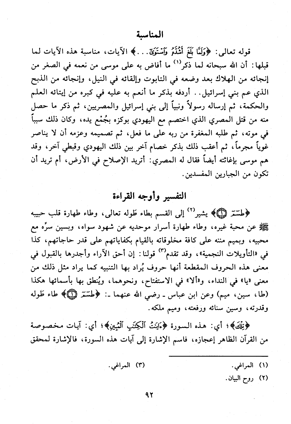 1 - {طسم (1)} يشير (¬2) إلى القسم بطاء طَوله تعالى، وطاء طهارة قلب حبيبه - صلى الله عليه وسلم - عن محبة غيره، وطاء طهارة أسرار موحديه عن شهود سواه، وبسين سرِّه مع محبيه، وبميم مننه على كافة مخلوقاته بالقيام بكفاياتهم على قدر حاجاتهم، كذا في "التأويلات النجمية"، وقد تقدم (¬3) قولنا: إن أحق الآراء وأجدرها بالقبول في معنى هذه الحروف المقطعة أنها حروف يُراد بها التنبيه كما يراد مثل ذلك من معنى "يا" في النداء، و"ألا" في الاستفتاح، ونحوهما، ويُنطق بها بأسمائها هكذا (طا، سين، ميم) وعن ابن عباس - رضي الله عنهما -: {طسم (1)} طاء طَوله وقدرته، وسين سنائه ورفعته، وميم ملكه.