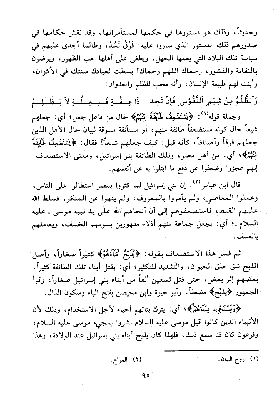 ثم فسر هذا الاستضعاف بقوله: {يُذَبِّحُ أَبْنَاءَهُمْ} كثيرًا صغارًا، وأصل الذبح شق حلق الحيوان، والتشديد للتكثير؛ أي: يقتل أبناء تلك الطائفة كثيرًا، بعضهم إثر بعض، حتى قتل تسعين ألفًا من أبناء بني إسرائيل صغارًا، وقرأ الجمهور {يذبِّح} مضعفًا، وأبو حيوة وابن محيصن بفتح الياء وسكون الذال.