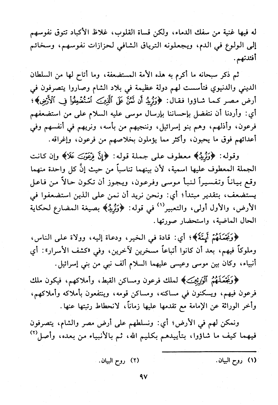 5 - ثم ذكر سبحانه ما أكرم به هذه الأمة المستضعفة، وما أتاح لها من السلطان المديني والدنيوي فتأسست لهم دولة عظيمة في بلاد الشام وصاروا يتصرفون في أرض مصر كما شاؤوا فقال: {وَنُرِيدُ أَنْ نَمُنَّ عَلَى الَّذِينَ اسْتُضْعِفُوا فِي الْأَرْضِ}؛ أي: وأردنا أن نتفضل بإحساننا برسال موسى عليه السلام على من استضعفهم فرعون، وأذلهم، وهم بنو إسرائيل، وننجيهم من باسه، ونريهم في أنفسهم وفي أعدائهم فوق ما يحبون، وأكثر مما يؤملون بخلاصهم من فرعون، وإغراقه.