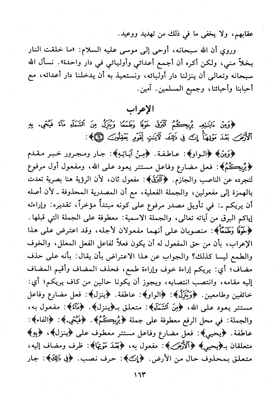 {وَمِنْ} {الواو}: عاطفة. {مِنْ آيَاتِهِ}: جار ومجرور خبر مقدم {يُرِيكُمُ}: فعل مضارع وفاعل مستتر يعود على الله، ومفعول أول مرفوع لتجرده عن الناصب والجازم. {الْبَرْقَ}: مفعول ثان؛ لأن الرؤية هنا بصرية تعدت بالهمزة إلى مفعولين، والجملة الفعلية، مع أن المصدرية المحذوفة - لأن أصله أن يريكم -: في تأويل مصدر مرفوع على كونه مبتدأً مؤخرًا، تقديره: وإراءته إياكم البرق من آياته تعالى، والجملة الاسمية: معطوفة على الجملة التي قبلها. {خَوْفًا وَطَمَعًا}: منصوبان على أنهما مفعولان لأجله، وقد اعترض على هذا الإعراب، بأن من حق المفعول له أن يكون فعلًا لفاعل الفعل المعلل، والخوف والطمع ليسا كذلك؟ والجواب عن هذا الاعتراض بأن يقال: بأنه على حذف مضاف؛ أي: يريكم إراءة خوف صاراءة طمع، فحذف المضاف وأقيم المضاف إليه مقامه، وانتصب انتصابه، ويجوز أن يكونا حالين من كاف يريكم؛ أي: خائفين وطامعين. {وَيُنَزِّلُ}: {الواو}: عاطفة. {يُنَزِّلُ}: فعل مضارع وفاعل مستتر يعود على الله، {مِنَ السَّمَاءِ}: متعلق بـ {يُنَزِّلُ}. {مَاءً}: مفعول به، والجملة: في محل الرفع معطوفة على جملة {يُرِيكُمُ}. {فَيُحْيِي}: {الفاء}: عاطفة. {يُحْيِي}: فعل مضارع وفاعل مستتر معطوف على {يُنَزِّلُ}، {بِهِ} متعلقان بـ {يُحْيِي} {الْأَرْضَ}: مفعول به، {بَعْدَ مَوْتِهَا}: ظرف ومضاف إليه، متعلق بمحذوف حال من الأرض. {إِنَّ}: حرف نصب. {فِي ذَلِكَ}: جار