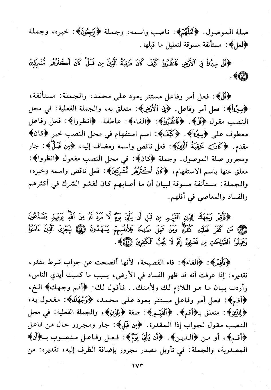 {فَأَقِمْ}: {الفاء}: فاء الفصيحة؛ لأنها أفصحت عن جواب شرط مقدر، تقديره: إذا عرفت أنه قد ظهر الفساد في الأرض، بسبب ما كسبت أيدي الناس، وأردت بيان ما هو اللازم لك ولأمتك .. فأقول لك: {أَقِمْ وَجْهَكَ} الخ، {أَقِمْ}: فعل أمر وفاعل مستتر يعود على محمد، {وَجْهَكَ}: مفعول به، {لِلدِّينِ}: متعلق بـ {أَقِمْ}. {القيم}: صفة {لِلدِّينِ}، والجملة الفعلية: في محل النصب مقول لجواب إذا المقدرة. {مِنْ قَبْلِ}: جار ومجرور حال من فاعل {أَقِمْ}، أو من {الدين}. {أَنْ يَأْتِيَ يَوْمٌ}: فعل وفاعل منصوب بـ {أَنْ} المصدرية، والجملة: في تأويل مصدر مجرور بإضافة الظرف إليه، تقديره: من