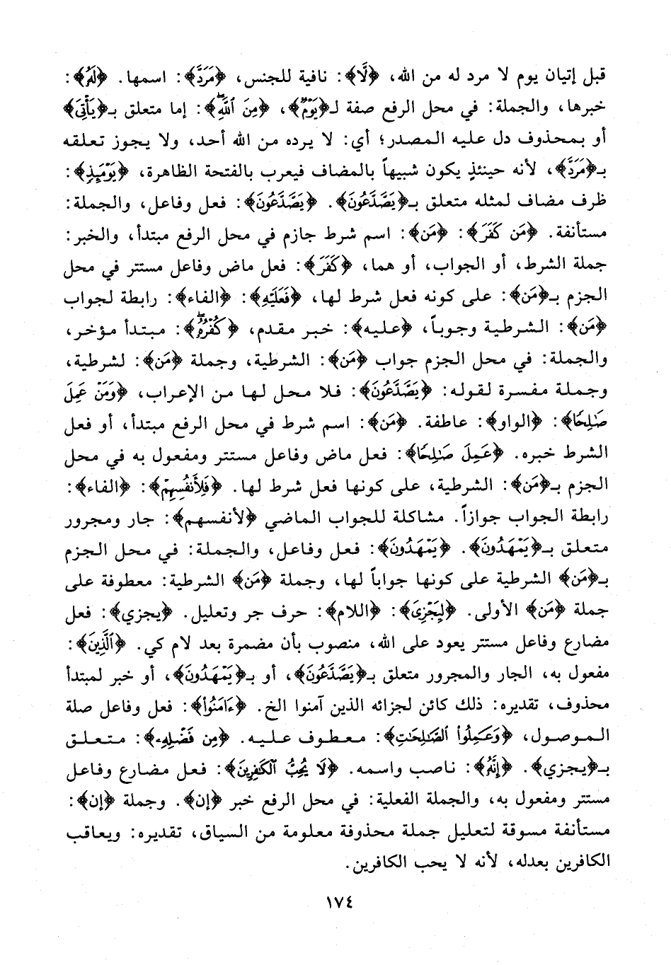 قبل إتيان يوم لا مرد له من الله، {لَا}: نافية للجنس، {مَرَدَّ}: اسمها. {لَهُ}: خبرها، والجملة: في محل الرفع صفة لـ {يَوْمٌ}، {مِنَ اللَّهِ}: إما متعلق بـ {يَأْتِيَ} أو بمحذوف أو بمحذوف دل عليه المصدر؛ أي: لا يرده من الله أحد، ولا يجوز تعلقه بـ {مَرَدَّ} لأنه حينئذٍ يكون شبيهًا بالمضاف فيعرب بالفتحة الظاهرة، {يَوْمَئِذٍ}: ظرف مضاف لمثله متعلق بـ {يَصَّدَّعُونَ}. {يَصَّدَّعُونَ}: فعل وفاعل، والجملة: مستأنفة. {مَنْ كَفَرَ}: {مَنْ}: اسم شرط جازم في محل الرفع مبتدأ، والخبر: جملة الشرط، أو الجواب، أو هما، {كَفَرَ}: فعل ماض وفاعل مستتر في محل الجزم بـ {مَن}: على كونه فعل شرط لها، {فَعَلَيْهِ}: {الفاء}: رابطة لجواب {مَن}: الشرطية وجوبًا، {عَلَيْهِ}: خبر مقدم، {كُفْرُهُ}: مبتدأ مؤخر، والجملة: في محل الجزم جواب {مَنْ}: الشرطية، وجملة {مَن}: الشرطية، وجملة مفسرة لقوله: {يَصَّدَّعُونَ}: فلا محل لها من الإعراب، {وَمَنْ عَمِلَ صَالِحًا}: {الواو}: عاطفة. {مَنْ}: اسم شرط في محل الرفع مبتدأ، أو فعل الشرط خبره. {عَمِلَ صَالِحًا}: فعل ماض وفاعل مستتر ومفعول به في محل الجزم بـ {مَن}: الشرطية، على كونها فعل شرط لها. {فَلِأَنْفُسِهِمْ}: {الفاء}: رابطة الجواب جوازًا. مشاكلة للجواب الماضي {لأنفسهم}: جار ومجرور متعلق بـ {يَمْهَدُونَ}. {يَمْهَدُونَ}: فعل وفاعل، والجملة: في محل الجزم بـ {مَن} الشرطية على كونها جوابًا لها، وجملة {مَن} الشرطية: معطوفة على جملة {مَن} الأولى. {لِيَجْزِيَ}: {اللام}: حرف جر وتعليل. {يَجْزِيَ}: فعل مضارع وفاعل مستتر يعود على الله، منصوب بأن مضمرة بعد لام كي. {الَّذِينَ}: مفعول به، الجار والمجرور متعلق بـ {يَصَّدَّعُونَ}، أو بـ {يَمْهَدُونَ}، أو خبر لمبتدأ محذوف، تقديره: ذلك كائن لجزائه الذين آمنوا الخ. {آمَنُوا}: فعل وفاعل صلة الموصول، {وَعَمِلُوا الصَّالِحَاتِ}: معطوف عليه. {مِنْ فَضْلِهِ}: متعلق بـ {يجزي}. {إنَّه}: ناصب واسمه. {لَا يُحِبُّ الْكَافِرِينَ}: فعل مضارع وفاعل مستتر ومفعول به، والجملة الفعلية: في محل الرفع خبر {إن}. وجملة {إن}: مستأنفة مسوقة لتعليل جملة محذوفة معلومة من السياق، تقديره: ويعاقب الكافرين بعدله؛ لأنه لا يحب الكافرين.