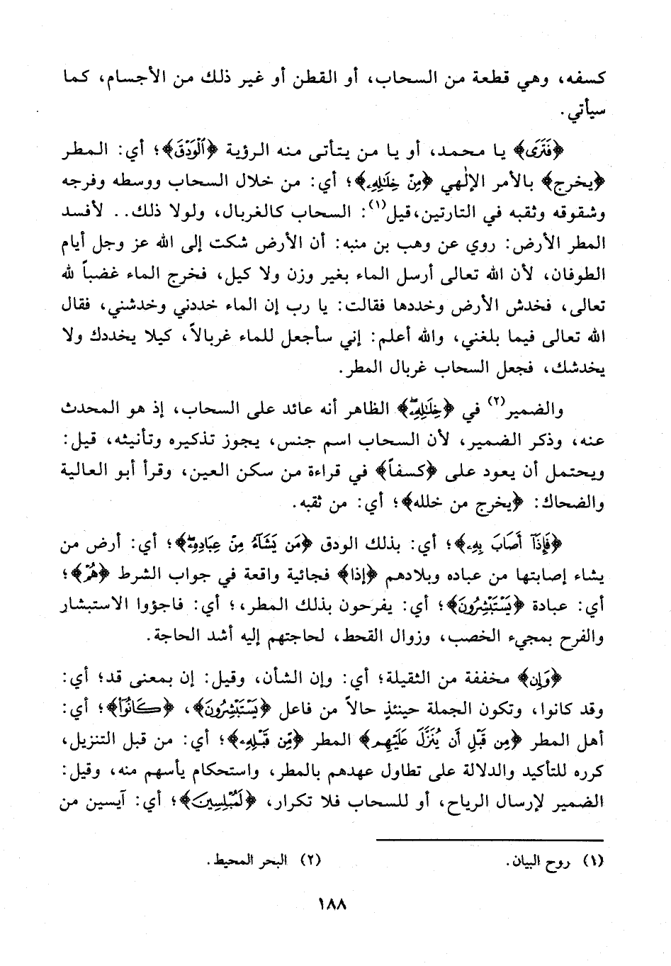 49 - {وَإِنْ} مخففة من الثقيلة؛ أي: وإن الشأن، وقيل: إن بمعنى قد؛ أي: وقد كانوا، وتكون الجملة حينئذٍ حالًا من فاعل {يَسْتَبْشِرُونَ}، {كَانُوا}؛ أي: أهل المطر {مِنْ قَبْلِ أَنْ يُنَزَّلَ عَلَيْهِمْ} المطر {مِنْ قَبْلِهِ}؛ أي: من قبل التنزيل، كرره للتأكيد والدلالة على تطاول عهدهم بالمطر، واستحكام يأسهم منه، وقيل: الضمير لإرسال الرياح، أو للسحاب فلا تكرار، {لَمُبْلِسِينَ}؛ أي: آيسين من