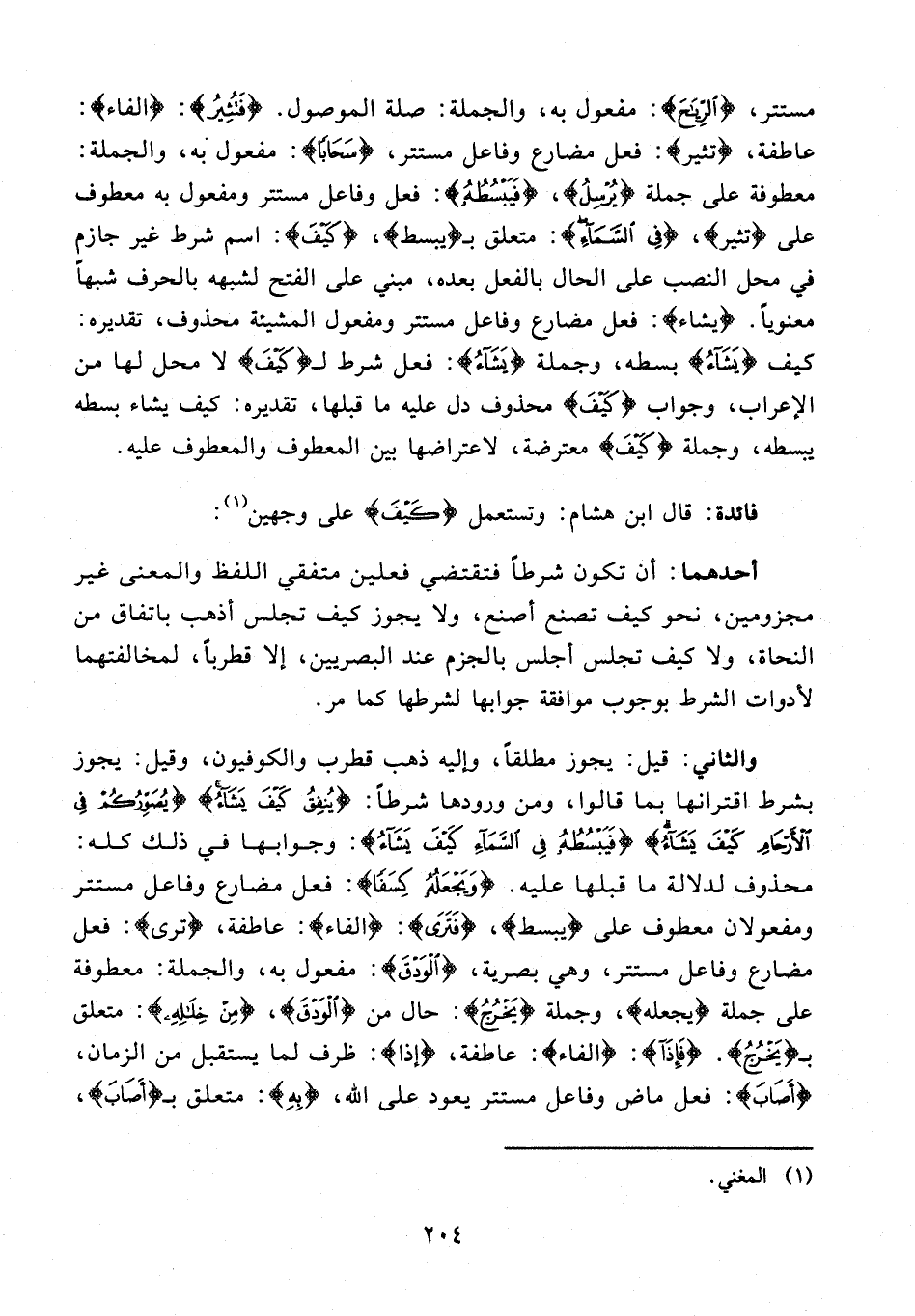 الثاني: قيل: يجوز مطلقًا، وإليه ذهب قطرب والكوفيون، وقيل: يجوز بشرط اقترانها بما قالوا، ومن ورودها شرطًا: {يُنْفِقُ كَيْفَ يَشَاءُ} {يُصَوِّرُكُمْ فِي الْأَرْحَامِ كَيْفَ يَشَاءُ} {فَيَبْسُطُهُ فِي السَّمَاءِ كَيْفَ يَشَاءُ}: وجوابها في ذلك كله: محذوف لدلالة ما قبلها عليه. {وَيَجْعَلُهُ كِسَفًا}: فعل مضارع وفاعل مستتر ومفعولان معطوف على {يَبْسُطُ}، {فَتَرَى}: {الفاء}: عاطفة، ترى: فعل مضارع وفاعل مستتر، وهي بصرية، {الْوَدْقَ}: مفعول به، والجملة: معطوفة على جملة {يجعله}، وجملة {يَخْرُجُ}: حال من {الْوَدْقَ}، {مِنْ خِلَالِهِ}: متعلق بـ {يَخْرُجُ}. {فَإِذَا}: {الفاء}: عاطفة، {إِذَا}: ظرف لما يستقبل من الزمان، {أَصَابَ}: فعل ماض وفاعل مستتر يعود على الله، {بِهِ}: متعلق بـ {أَصَابَ}،