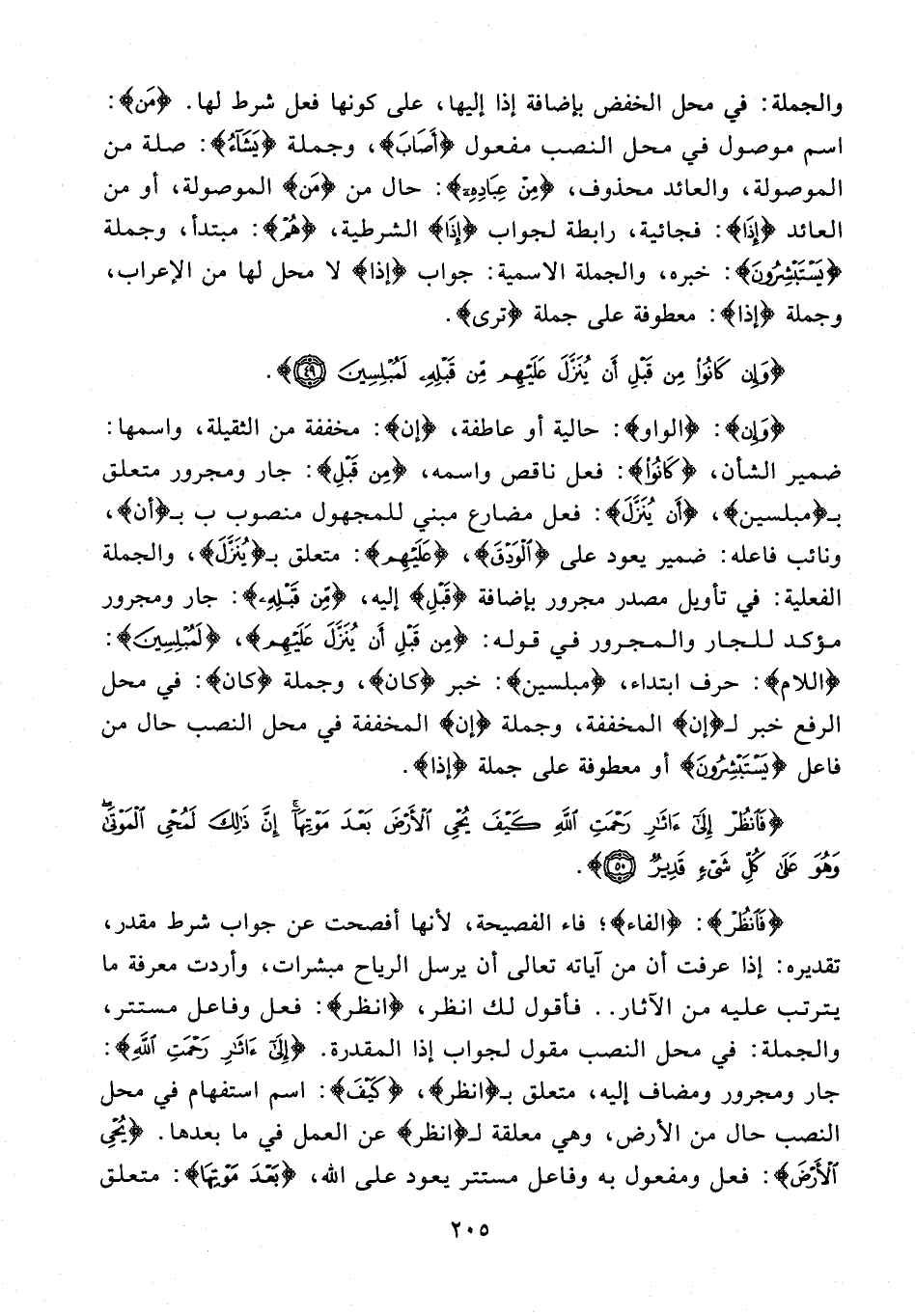 {وَإِنْ}: {الواو}: حالية أو عاطفة، {إن}: مخففة من الثقيلة، واسمها: ضمير الشأن، {كَانُوا}: فعل ناقص واسمه، {مِنْ قَبْلِ}: جار ومجرور متعلق بـ {مُبْلِسِينَ}، {أَنْ يُنَزَّلَ}: فعل مضارع مبني للمجهول منصوب بـ {أَنْ}، ونائب فاعله: ضمير يعود على {الْوَدْقَ}، {عَلَيْهِمْ}: متعلق بـ {يُنَزَّلَ}، والجملة الفعلية: في تأويل مصدر مجرور بإضافة {قَبْلِ} إليه، {مِنْ قَبْلِهِ}: جار ومجرور مؤكد للجار والمجرور في قوله: {مِنْ قَبْلِ أَنْ يُنَزَّلَ عَلَيْهِمْ}، {لَمُبْلِسِينَ}: {اللام}: حرف ابتداء، {مُبْلِسِينَ}: خبر {كَانُ}، وجملة {كَانُ}: في محل الرفع خبر لـ {إنَّ} المخففة، وجملة {إِن} المخففة في محل النصب حال من فاعل {يَسْتَبْشِرُونَ} أو معطوفة على جملة {إِذَا}.