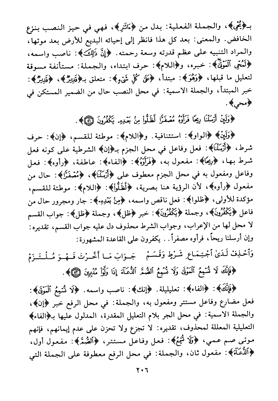 بـ {يُحْيِ}، والجملة الفعلية: بدل من {آثَارِ}، فهي في حيز النصب بنزع الخافض. والمعنى: بعد كل هذا فانظر إلى إحيائه البديع للأرض بعد موتها، والمراد التنبيه على عظم قدرته وسعة رحمته. {إِنَّ ذَلِكَ}: ناصب واسمه، {لَمُحْيِ الْمَوْتَى}: خبره، و {اللام}: حرف ابتداء، والجملة: مستأنفة مسوقة لتعليل ما قبلها، {وَهُوَ}: مبتدأ، {عَلَى كُلِّ شَيْءٍ}: متعلق بـ {قَدِيرٌ}، {قَدِيرٌ}: خبر المبتدأ، والجملة الاسمية: في محل النصب حال من الضمير المستكن في {مُحْيِ}.