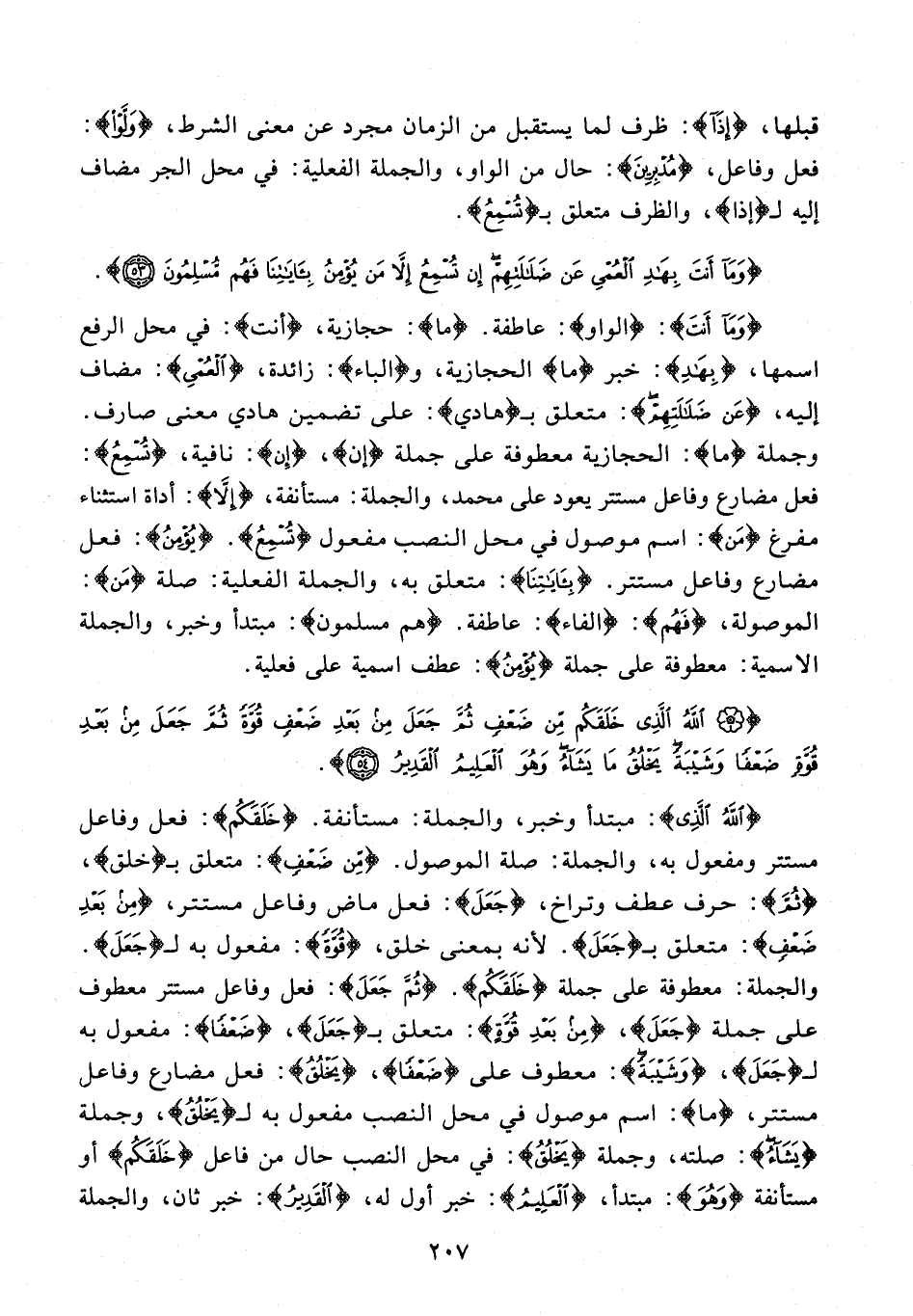 {اللَّهُ الَّذِي}: مبتدأ وخبر، والجملة: مستأنفة. {خَلَقَكُمْ}: فعل وفاعل مستتر ومفعول به، والجملة: صلة الموصول. {مِنْ ضَعْفٍ}: متعلق بـ {خَلَقَ}، {ثُمَّ}: حرف عطف وتراخ، {جَعَلَ}: فعل ماض وفاعل مستتر، {مِنْ بَعْدِ ضَعْفٍ}: متعلق بـ {جَعَلَ}. لأنه بمعنى خلق، {قُوَّةً}: مفعول به لـ {جَعَلَ}. والجملة: معطوفة على جملة {خَلَقَكُمْ}. {ثُمَّ جَعَلَ}: فعل وفاعل مستتر معطوف على جملة {جَعَلَ}، {مِنْ بَعْدِ قُوَّةٍ}: متعلق بـ {جَعَلَ}، {ضَعْفًا}: مفعول به لـ {جَعَلَ}، {وَشَيْبَةً}: معطوف على {ضَعْفًا}، {يَخْلُقُ}: فعل مضارع وفاعل مستتر، {ما}: اسم موصول في محل النصب مفعول به لـ {يَخْلُقُ}، وجملة {يَشَاءُ}: صلته، وجملة {يَخْلُقُ}: في محل النصب حال أو فاعل {خَلَقَكُمْ} أو مستأنفة {وَهُوَ}: مبتدأ، {الْعَلِيمُ}: خبر أول له، {الْقَدِيرُ}: خبر ثان، والجملة