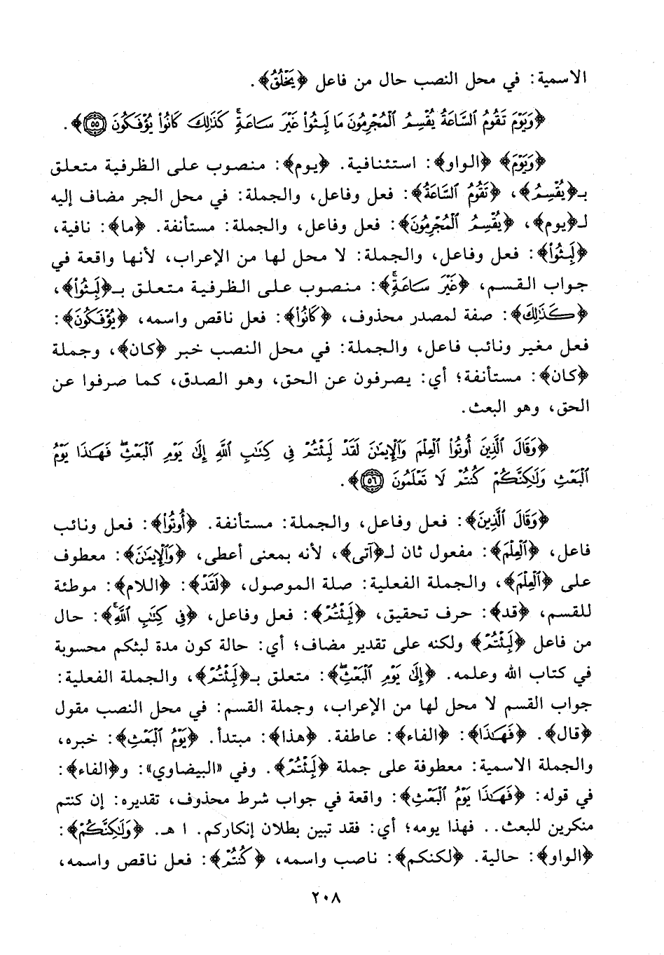 {وَيَوْمَ} {الواو}: استئنافية. {يَوْمَ}: منصوب على الظرفية متعلق بـ {يُقْسِمُ}، {تَقُومُ السَّاعَةُ}: فعل وفاعل، والجملة: في محل الجر مضاف إليه لـ {يَوْمَ}، {يُقْسِمُ الْمُجْرِمُونَ}: فعل وفاعل، والجملة: مستأنفة. {ما}: نافية، {لَبِثُوا}: فعل وفاعل، والجملة: لا محل لها أو الإعراب؛ لأنها واقعة في جواب القسم، {غَيْرَ سَاعَةٍ}: منصوب على الظرفية متعلق بـ {لَبِثُوا}، {كَذَلِكَ}: صفة لمصدر محذوف، {كَانُوا}: فعل ناقص واسمه، {يُؤْفَكُونَ}: فعل مغير ونائب فاعل، والجملة: في محل النصب خبر {كان}، وجملة {كان}: مستأنفة؛ أي: يصرفون عز الحق، وهو الصدق، كما صرفوا عن الحق، وهو البعث.