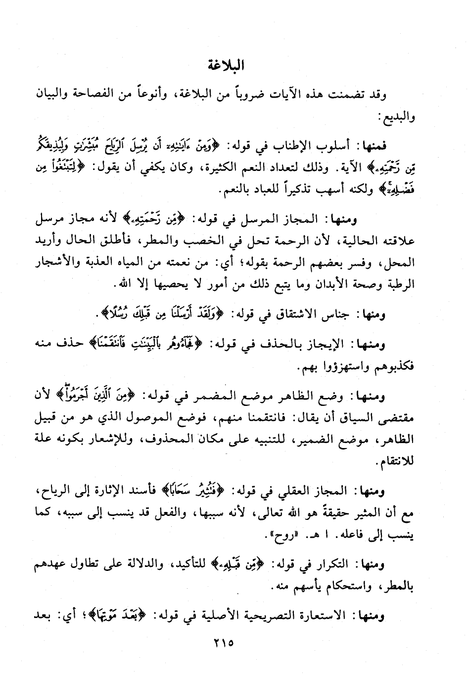 فمنها: أسلوب الإطناب في قوله: {وَمِنْ آيَاتِهِ أَنْ يُرْسِلَ الرِّيَاحَ مُبَشِّرَاتٍ وَلِيُذِيقَكُمْ مِنْ رَحْمَتِهِ} الآية. وذلك لتعداد النعم الكثيرة، وكان يكفي أن يقول: {لِتَبْتَغُوا مِنْ فَضْلِهِ} ولكنه أسهب تذكيرًا للعباد بالنعم.