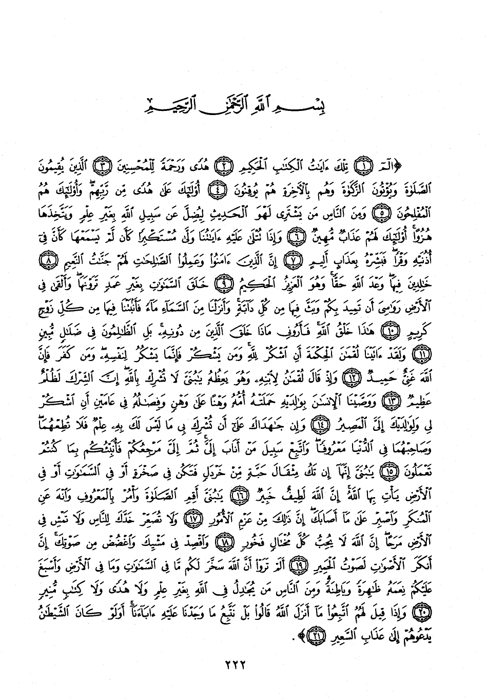 {الم (1) تِلْكَ آيَاتُ الْكِتَابِ الْحَكِيمِ (2) هُدًى وَرَحْمَةً لِلْمُحْسِنِينَ (3) الَّذِينَ يُقِيمُونَ الصَّلَاةَ وَيُؤْتُونَ الزَّكَاةَ وَهُمْ بِالْآخِرَةِ هُمْ يُوقِنُونَ (4) أُولَئِكَ عَلَى هُدًى مِنْ رَبِّهِمْ وَأُولَئِكَ هُمُ الْمُفْلِحُونَ (5) وَمِنَ النَّاسِ مَنْ يَشْتَرِي لَهْوَ الْحَدِيثِ لِيُضِلَّ عَنْ سَبِيلِ اللَّهِ بِغَيْرِ عِلْمٍ وَيَتَّخِذَهَا هُزُوًا أُولَئِكَ لَهُمْ عَذَابٌ مُهِينٌ (6) وَإِذَا تُتْلَى عَلَيْهِ آيَاتُنَا وَلَّى مُسْتَكْبِرًا كَأَنْ لَمْ يَسْمَعْهَا كَأَنَّ فِي أُذُنَيْهِ وَقْرًا فَبَشِّرْهُ بِعَذَابٍ أَلِيمٍ (7) إِنَّ الَّذِينَ آمَنُوا وَعَمِلُوا الصَّالِحَاتِ لَهُمْ جَنَّاتُ النَّعِيمِ (8) خَالِدِينَ فِيهَا وَعْدَ اللَّهِ حَقًّا وَهُوَ الْعَزِيزُ الْحَكِيمُ (9) خَلَقَ السَّمَاوَاتِ بِغَيْرِ عَمَدٍ تَرَوْنَهَا وَأَلْقَى فِي الْأَرْضِ رَوَاسِيَ أَنْ تَمِيدَ بِكُمْ وَبَثَّ فِيهَا مِنْ كُلِّ دَابَّةٍ وَأَنْزَلْنَا مِنَ السَّمَاءِ مَاءً فَأَنْبَتْنَا فِيهَا مِنْ كُلِّ زَوْجٍ كَرِيمٍ (10) هَذَا خَلْقُ اللَّهِ فَأَرُونِي مَاذَا خَلَقَ الَّذِينَ مِنْ دُونِهِ بَلِ الظَّالِمُونَ فِي ضَلَالٍ مُبِينٍ (11) وَلَقَدْ آتَيْنَا لُقْمَانَ الْحِكْمَةَ أَنِ اشْكُرْ لِلَّهِ وَمَنْ يَشْكُرْ فَإِنَّمَا يَشْكُرُ لِنَفْسِهِ وَمَنْ كَفَرَ فَإِنَّ اللَّهَ غَنِيٌّ حَمِيدٌ (12) وَإِذْ قَالَ لُقْمَانُ لِابْنِهِ وَهُوَ يَعِظُهُ يَا بُنَيَّ لَا تُشْرِكْ بِاللَّهِ إِنَّ الشِّرْكَ لَظُلْمٌ عَظِيمٌ (13) وَوَصَّيْنَا الْإِنْسَانَ بِوَالِدَيْهِ حَمَلَتْهُ أُمُّهُ وَهْنًا عَلَى وَهْنٍ وَفِصَالُهُ فِي عَامَيْنِ أَنِ اشْكُرْ لِي وَلِوَالِدَيْكَ إِلَيَّ الْمَصِيرُ (14) وَإِنْ جَاهَدَاكَ عَلَى أَنْ تُشْرِكَ بِي مَا لَيْسَ لَكَ بِهِ عِلْمٌ فَلَا تُطِعْهُمَا وَصَاحِبْهُمَا فِي الدُّنْيَا مَعْرُوفًا وَاتَّبِعْ سَبِيلَ مَنْ أَنَابَ إِلَيَّ ثُمَّ إِلَيَّ مَرْجِعُكُمْ فَأُنَبِّئُكُمْ بِمَا كُنْتُمْ تَعْمَلُونَ (15) يَا بُنَيَّ إِنَّهَا إِنْ تَكُ مِثْقَالَ حَبَّةٍ مِنْ خَرْدَلٍ فَتَكُنْ فِي صَخْرَةٍ أَوْ فِي السَّمَاوَاتِ أَوْ فِي الْأَرْضِ يَأْتِ بِهَا اللَّهُ إِنَّ اللَّهَ لَطِيفٌ خَبِيرٌ (16) يَا بُنَيَّ أَقِمِ الصَّلَاةَ وَأْمُرْ بِالْمَعْرُوفِ وَانْهَ عَنِ الْمُنْكَرِ وَاصْبِرْ عَلَى مَا أَصَابَكَ إِنَّ ذَلِكَ مِنْ عَزْمِ الْأُمُورِ (17) وَلَا تُصَعِّرْ خَدَّكَ لِلنَّاسِ وَلَا تَمْشِ فِي الْأَرْضِ مَرَحًا إِنَّ اللَّهَ لَا يُحِبُّ كُلَّ مُخْتَالٍ فَخُورٍ (18) وَاقْصِدْ فِي مَشْيِكَ وَاغْضُضْ مِنْ صَوْتِكَ إِنَّ أَنْكَرَ الْأَصْوَاتِ لَصَوْتُ الْحَمِيرِ (19) أَلَمْ تَرَوْا أَنَّ اللَّهَ سَخَّرَ لَكُمْ مَا فِي السَّمَاوَاتِ وَمَا فِي الْأَرْضِ وَأَسْبَغَ عَلَيْكُمْ نِعَمَهُ ظَاهِرَةً وَبَاطِنَةً وَمِنَ النَّاسِ مَنْ يُجَادِلُ فِي اللَّهِ بِغَيْرِ عِلْمٍ وَلَا هُدًى وَلَا كِتَابٍ مُنِيرٍ (20) وَإِذَا قِيلَ لَهُمُ اتَّبِعُوا مَا أَنْزَلَ اللَّهُ قَالُوا بَلْ نَتَّبِعُ مَا وَجَدْنَا عَلَيْهِ آبَاءَنَا أَوَلَوْ كَانَ الشَّيْطَانُ يَدْعُوهُمْ إِلَى عَذَابِ السَّعِيرِ (21)}.