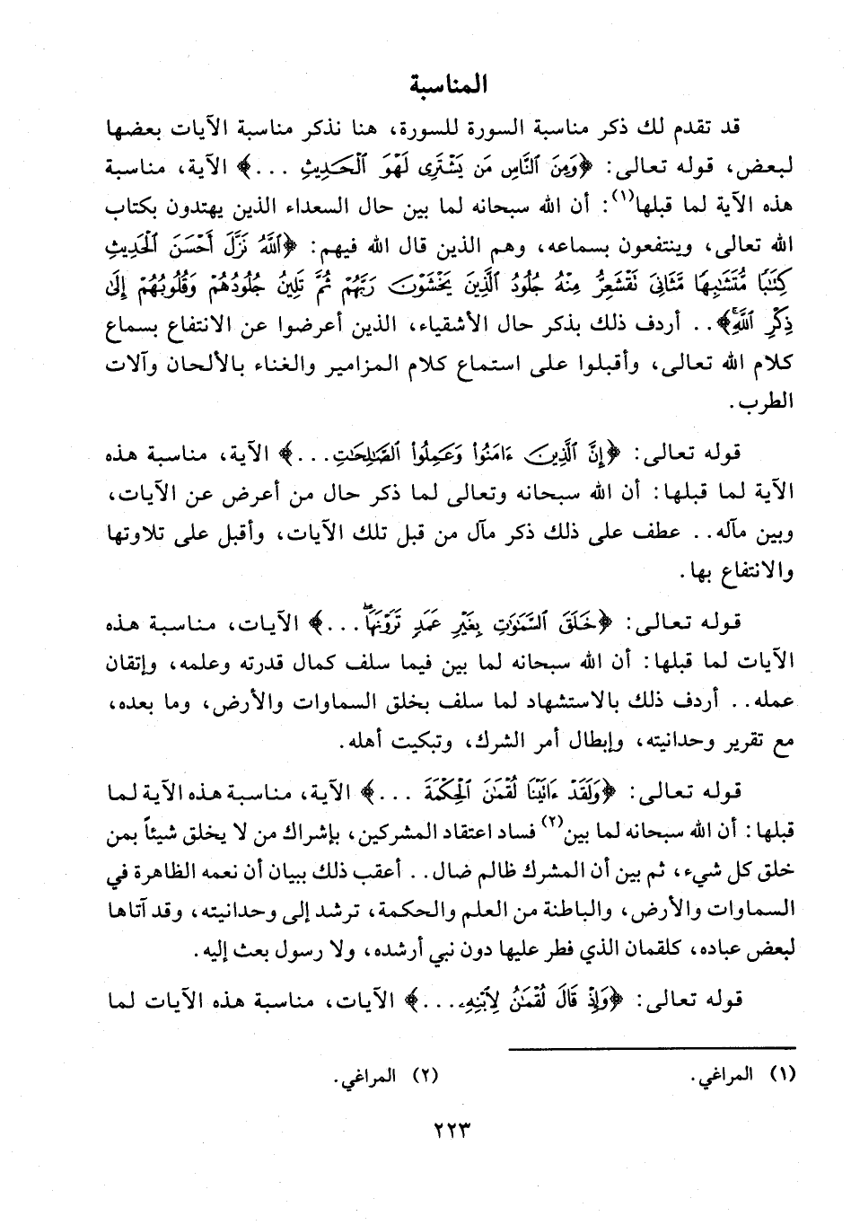 قد تقدم لك ذكر مناسبة السورة للسورة، هنا نذكر مناسبة الآيات بعضها لبعض، قوله تعالى: {وَمِنَ النَّاسِ مَنْ يَشْتَرِي لَهْوَ الْحَدِيثِ ...} الآية، مناسبة هذه الآية لما قبلها (¬1): أن الله سبحانه لما بين حال السعداء الذين يهتدون بكتاب الله تعالى، وينتفعون بسماعه، وهم الذين قال الله فيهم: {اللَّهُ نَزَّلَ أَحْسَنَ الْحَدِيثِ كِتَابًا مُتَشَابِهًا مَثَانِيَ تَقْشَعِرُّ مِنْهُ جُلُودُ الَّذِينَ يَخْشَوْنَ رَبَّهُمْ ثُمَّ تَلِينُ جُلُودُهُمْ وَقُلُوبُهُمْ إِلَى ذِكْرِ اللَّهِ} .. أردف ذلك بذكر حال الأشقياء، الذين أعرضوا عن الانتفاع بسماع كلام الله تعالى، وأقبلوا على استماع كلام المزامير والغناء بالألحان وآلات الطرب.