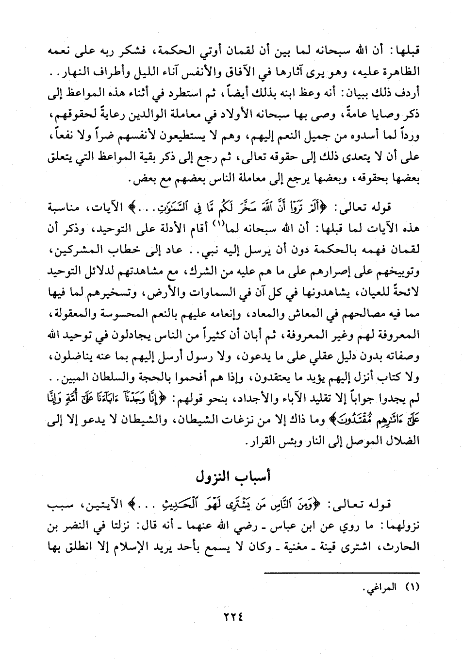 قوله تعالى: {وَمِنَ النَّاسِ مَنْ يَشْتَرِي لَهْوَ الْحَدِيثِ ...} الآيتين، سبب نزولهما: ما روي عن ابن عباس - رضي الله عنهما - أنه قال: نزلتا في النضر بن الحارث، اشترى قينة - مغنية - وكان لا يسمع بأحد يريد الإِسلام إلا انطلق بها