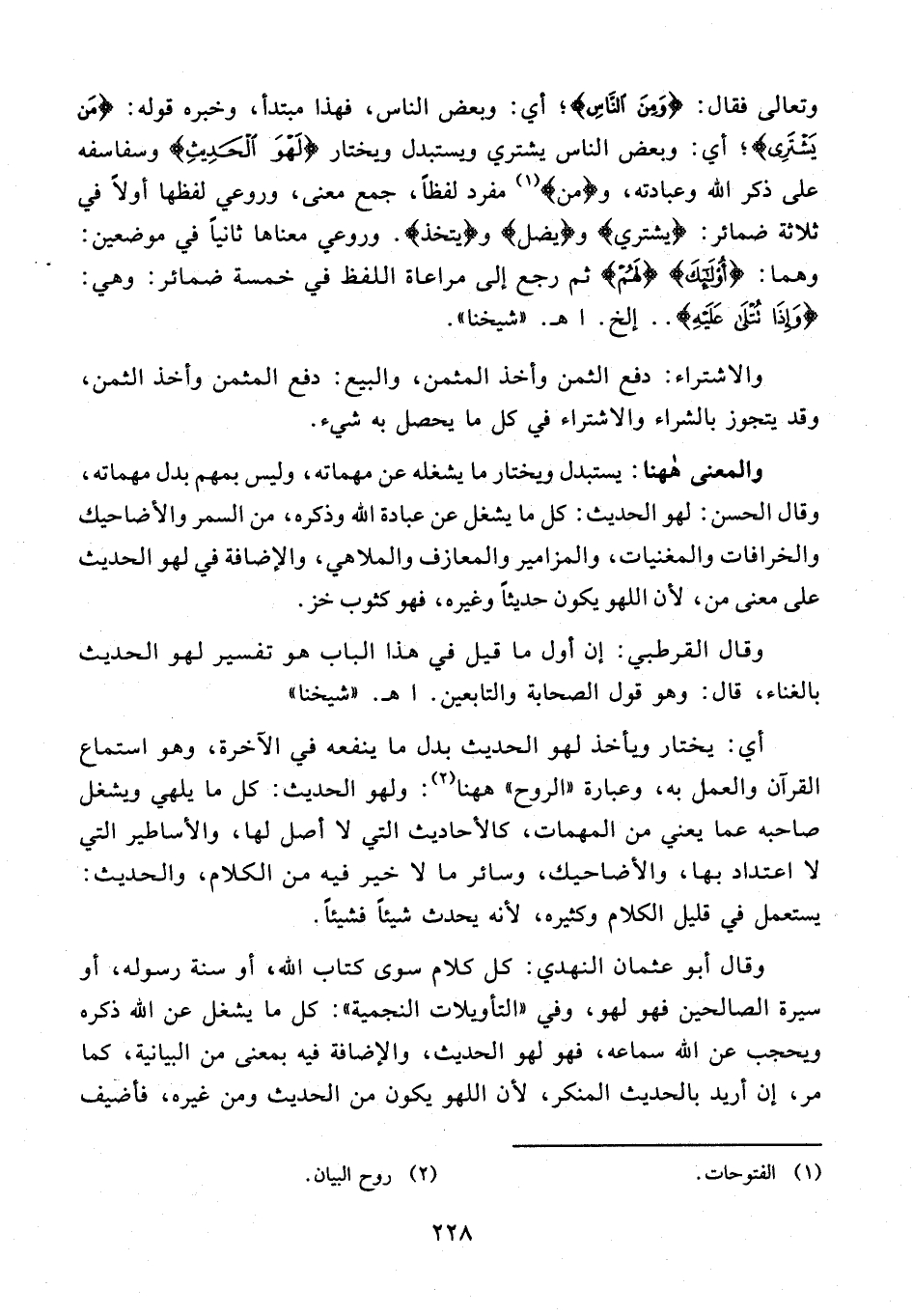 وقال القرطبي: إن أول ما قيل في هذا الباب هو تفسير لهو الحديث بالغناء، قال: وهو قول الصحابة والتابعين. اهـ. "شيخنا"