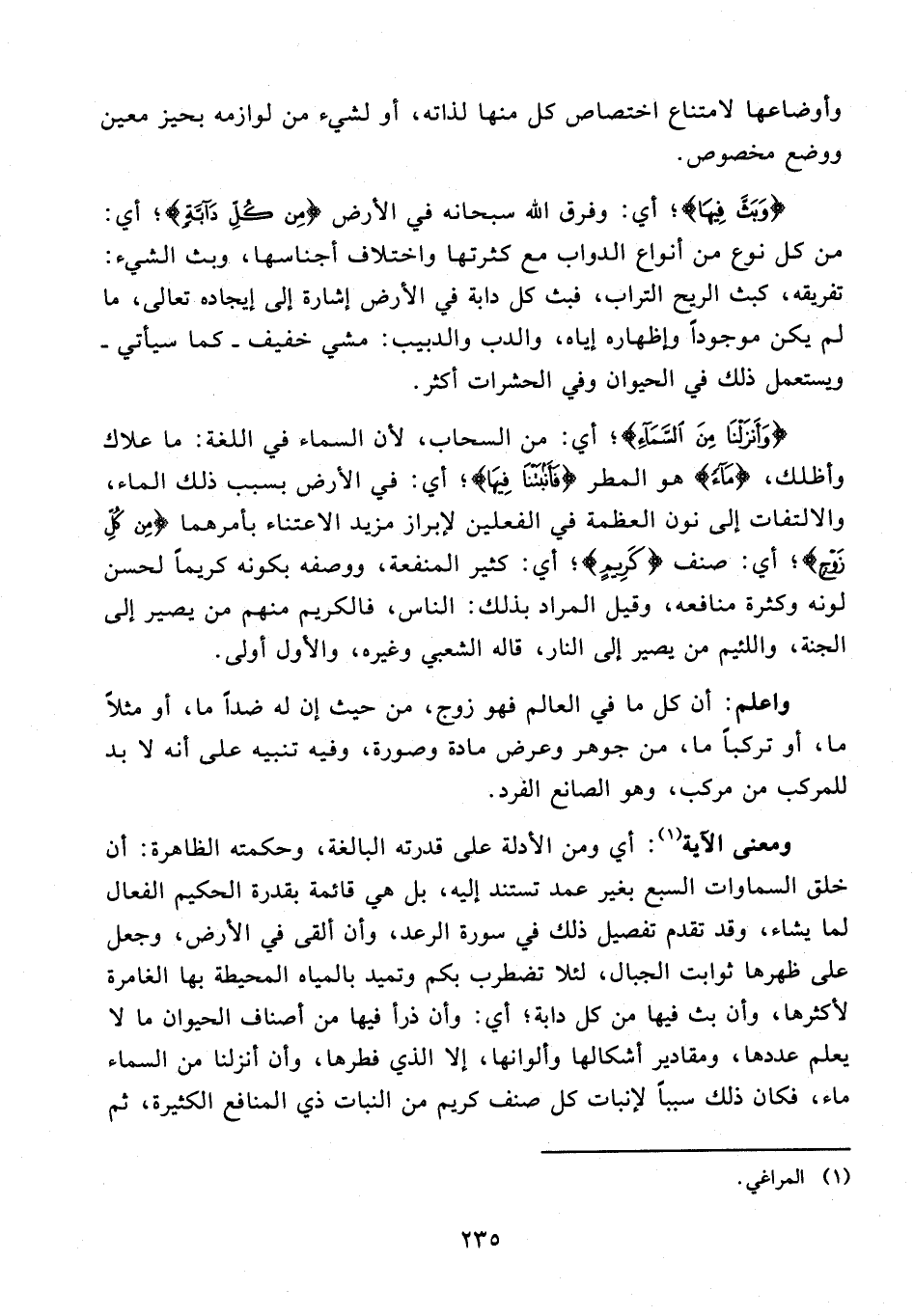 ومعنى الآية (¬1): أي ومن الأدلة على قدرته البالغة، وحكمته الظاهرة: أن خلق السماوات السبع بغير عمد تستند إليه، بل هي قائمة بقدرة الحكيم الفعال لما يشاء، وقد تقدم تفصيل ذلك في سورة الرعد، وأن ألقى في الأرض، وجعل على ظهرها ثوابت الجبال، لئلا تضطرب بكم وتميد بالمياه المحيطة بها الغامرة لأكثرها، وأن بث فيها من كل دابة؛ أي: وأن ذرأ فيها من أصناف الحيوان ما لا يعلم عددها، ومقادير أشكالها وألوانها، إلا الذي فطرها، وأن أنزلنا من السماء ماء، فكان ذلك سببًا لإنبات كل صنف كريم من النبات ذي المنافع الكثيرة،