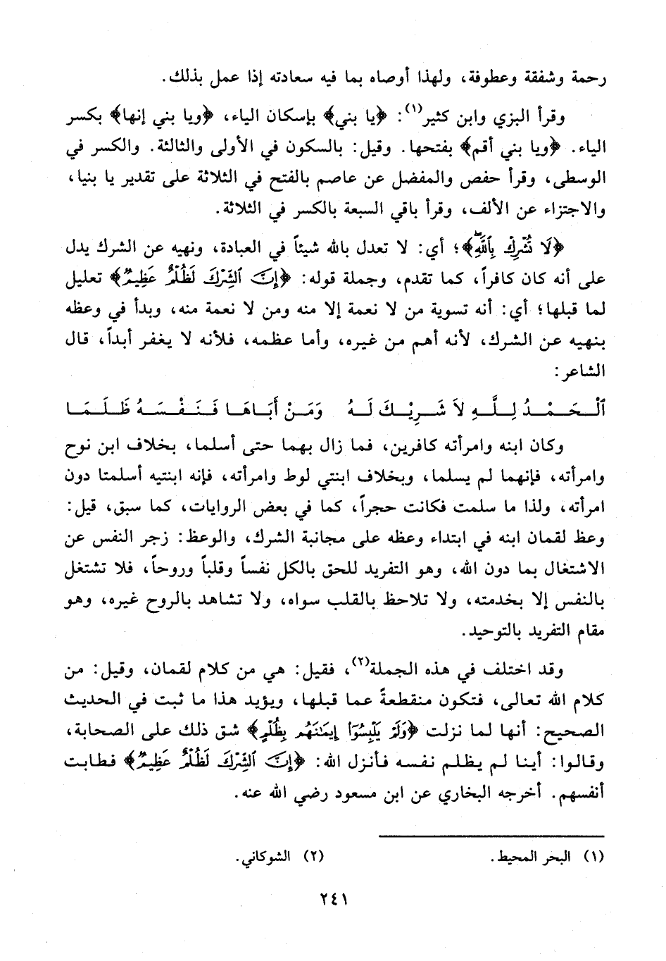 وقد اختلف في هذه الجملة (¬2)، فقيل: هي من كلام لقمان، وقيل: من كلام الله تعالى، فتكون منقطعة عما قبلها، ويؤيد هذا ما ثبت في الحديث الصحيح: أنها لما نزلت {وَلَمْ يَلْبِسُوا إِيمَانَهُمْ بِظُلْمٍ} شق ذلك على الصحابة، وقالوا: أينا لم يظلم نفسه فأنزل الله: {إِنَّ الشِّرْكَ لَظُلْمٌ عَظِيمٌ} فطابت أنفسهم. أخرجه البخاري عن ابن مسعود رضي الله عنه.